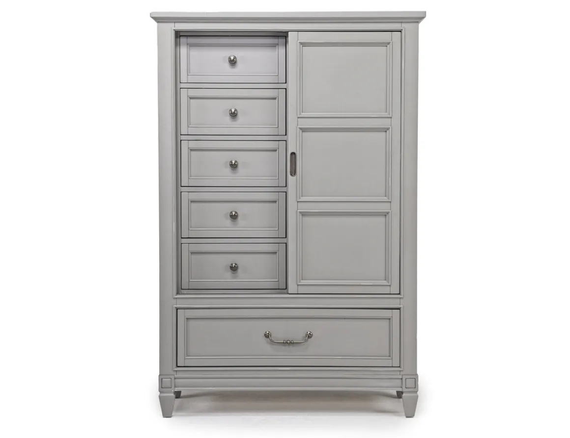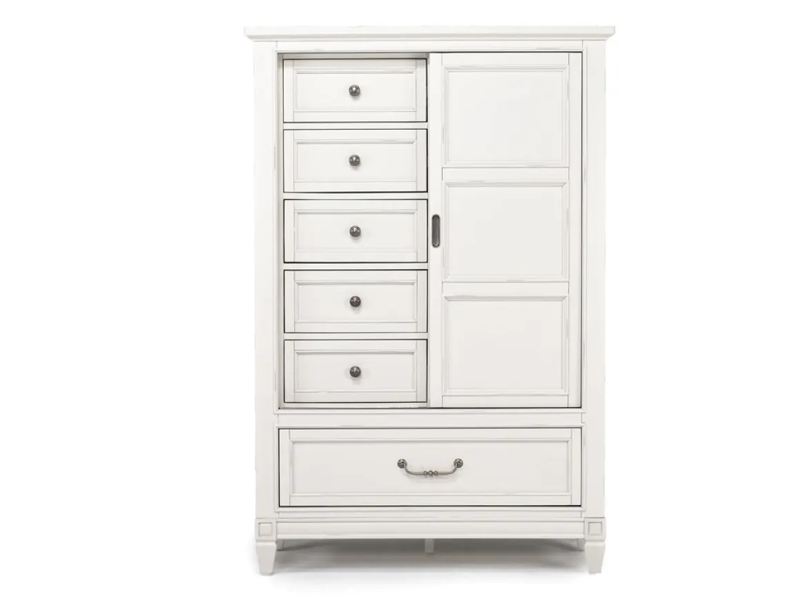 A smart, elegant addition to any bedroom, the Willowbrook Door Chest in Egg Shell White is both a striking piece of furniture and a useful storage space. It has six drawers, which are perfect for organizing your clothing and accessories. The frame is made of hardwood solids and birch veneer, which will provide a lot of use. The white finish gives this piece a clean, modern look that will fit in with any decor.Product Details:• Boasts six spacious drawers• The side-mounted ball bearing drawer glides ensure smooth operation• The English dove tail construction provides strength and durability
