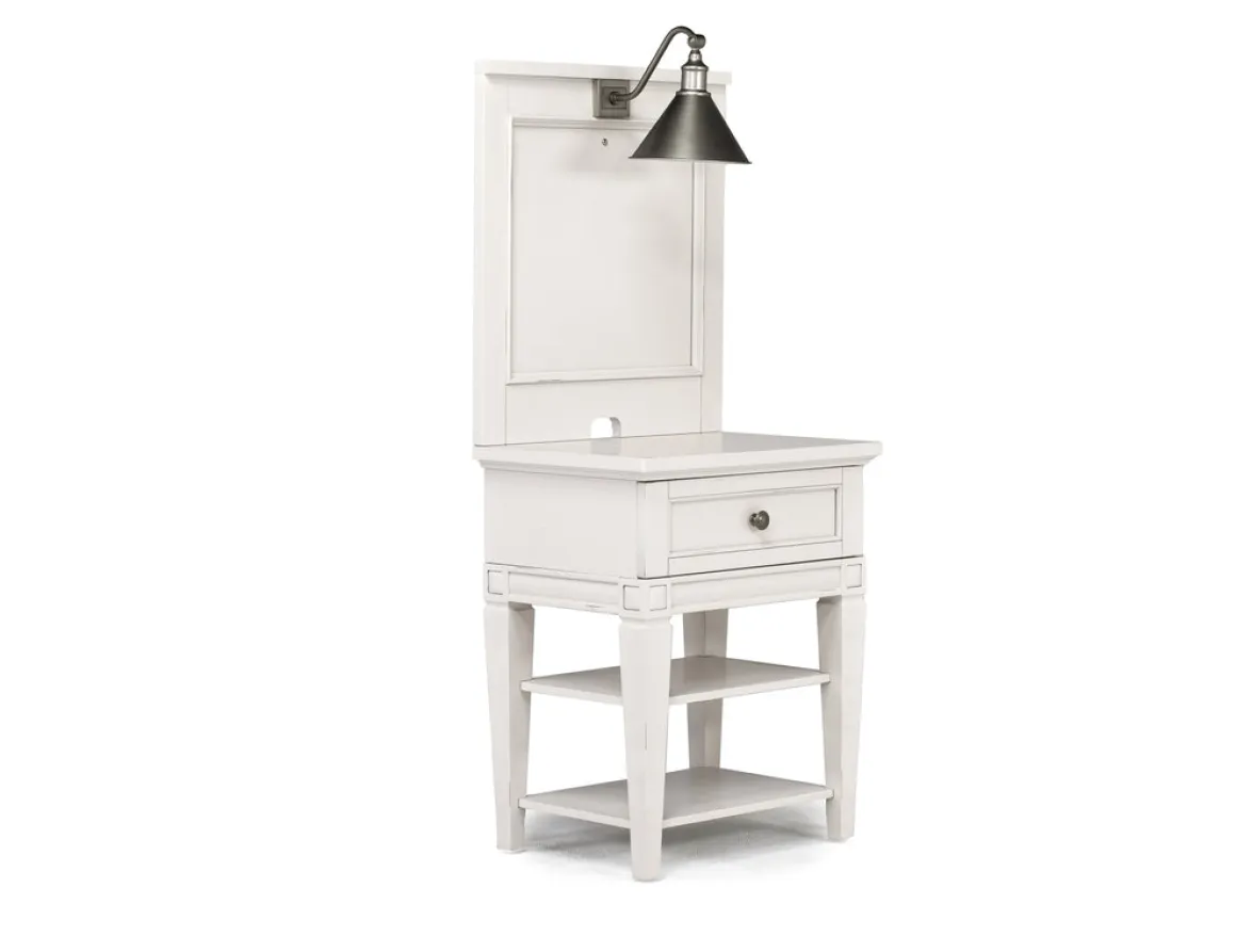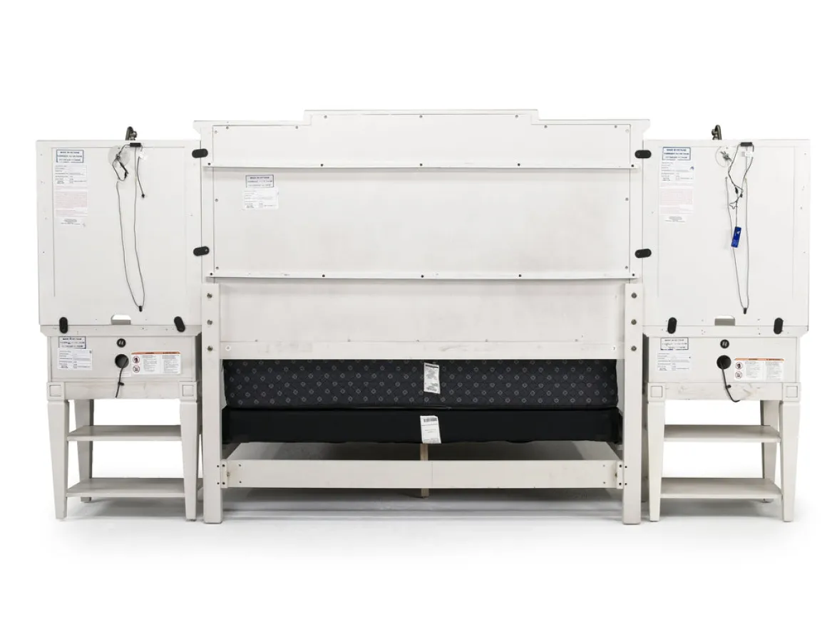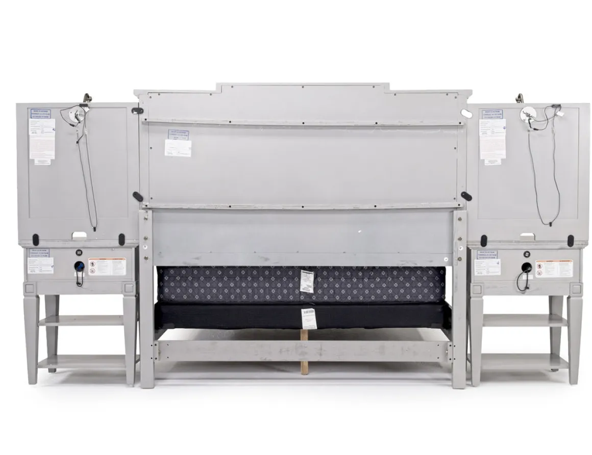 Relax and read your favorite book on this Willowbrook Panel Wall Bed in Pebble, Queen bed. Notice the convenient lighting on both sides of the headboard, and the elegant design details. This panel wall bed includes matching nightstands with matching hardware, so the overall appearance is balanced and complete. The nightstand drawers pull out easily, smoothly and quietly. Product Details: • Queen size mattress is sold separately • Mellow, neutral pebble gray color goes with any floor and wall coverings • Crafted of wood, birch and veneer