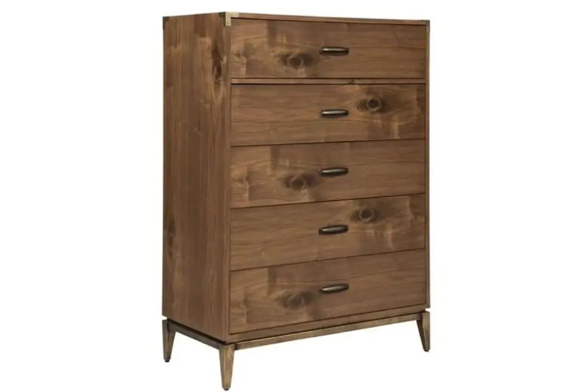 The exquisite Adler Chest in Natural Walnut will bring a contemporary style to any bedroom environment. This five-drawer chest is crafted from kiln-dried knotty black walnut veneer and finished in a clear matte lacquer finish to create a piece that is both simple and sophisticated. With full extension, ball-bearing drawer slides, and a five-sided hardwood plywood drawer box with English dovetail joinery, this chest provides ample storage space for all your essentials.Product Details:• Bronzed brass campaign-style corner brackets• Tapered metal legs• Kiln-dried knotty black walnut veneer