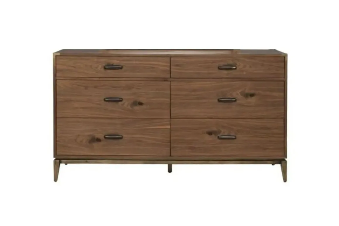 Creating the perfect marriage of mid-century style and contemporary design, the Adler Dresser in Natural Walnut features a simple yet sophisticated profile. Constructed with walnut veneers in a knotty walnut finish, this fantastic dresser features bronzed brass campaign-style corner brackets and tapered metal legs to provide a subtle contrast to the warm tones of the timber, creating a look that is fresh and timeless.Product Details:• Full extension, ball-bearing drawer slides• 5-sided hardwood plywood drawer box with English dovetail joinery• All wood is kiln-dried for added strength and lasting beauty