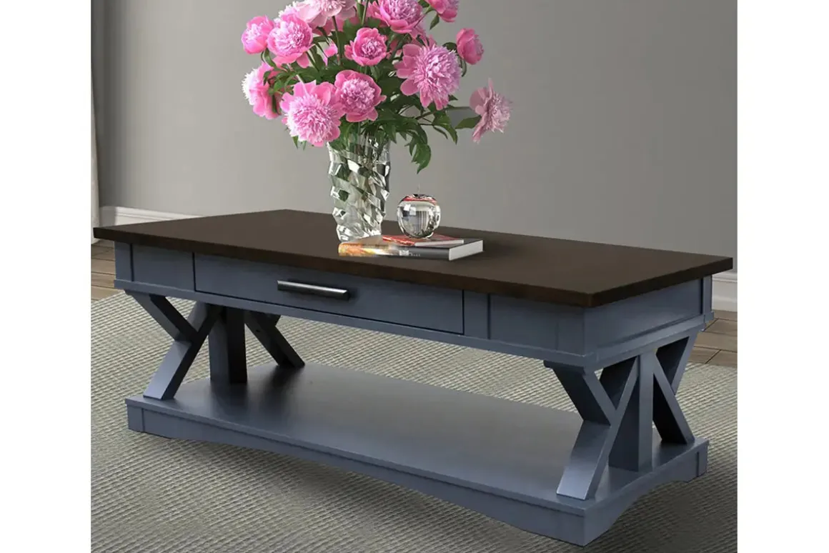 Every living room needs a great coffee table, and the Americana Coffee Table in Gray will surely look great in yours. The trestle style table with a slab top provides lots of room for books, drinks, snacks, or whatever you want to put on it. A convenient storage drawer helps you keep your space organized and tidy. The Americana Coffee Table in Gray looks great with any accent color and is sure to complement your space.