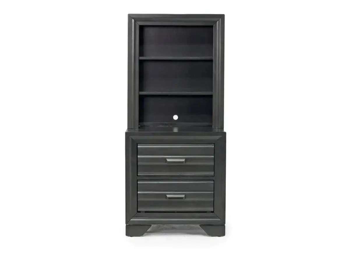 Take your bedroom decor to the next level with this beautiful Andes Nightstand and Hutch in Charcoal. This piece has a minimalist look with clean lines that give it a sophisticated appeal. It is made from solid wood, which ensures its durability. And the gray finish gives it an elegant look without being too dark or heavy-handed. It’ll match any decor!