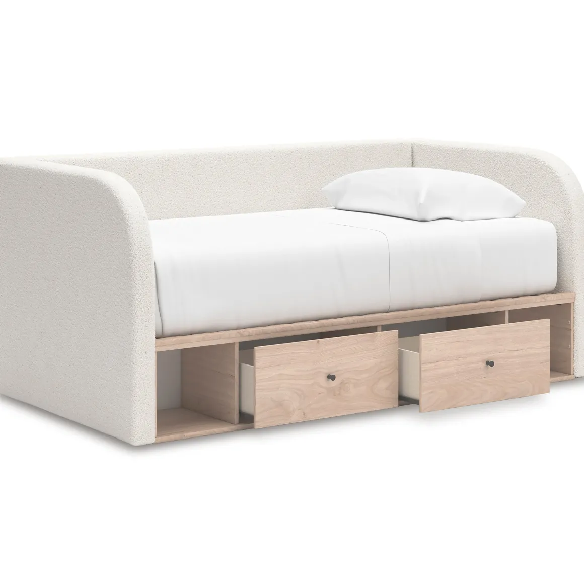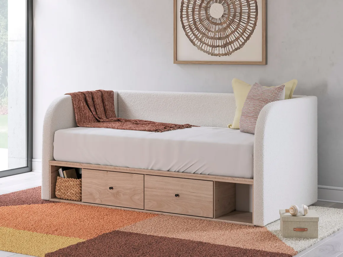 Make the most of your space with the Arloster Upholstered Daybed w/ Storage Trundle in Tan/White, Twin. This versatile piece combines modern style with practical functionality, featuring a soft, textured upholstered back and arms in a soothing white tone paired with a warm tan base. Perfect for smaller rooms or guest spaces, it includes a pull-out trundle for extra sleeping accommodations and two roomy drawers for storing bedding, pillows, or essentials. Its clean lines and neutral palette make it an easy fit for contemporary, transitional, or minimalist decor.