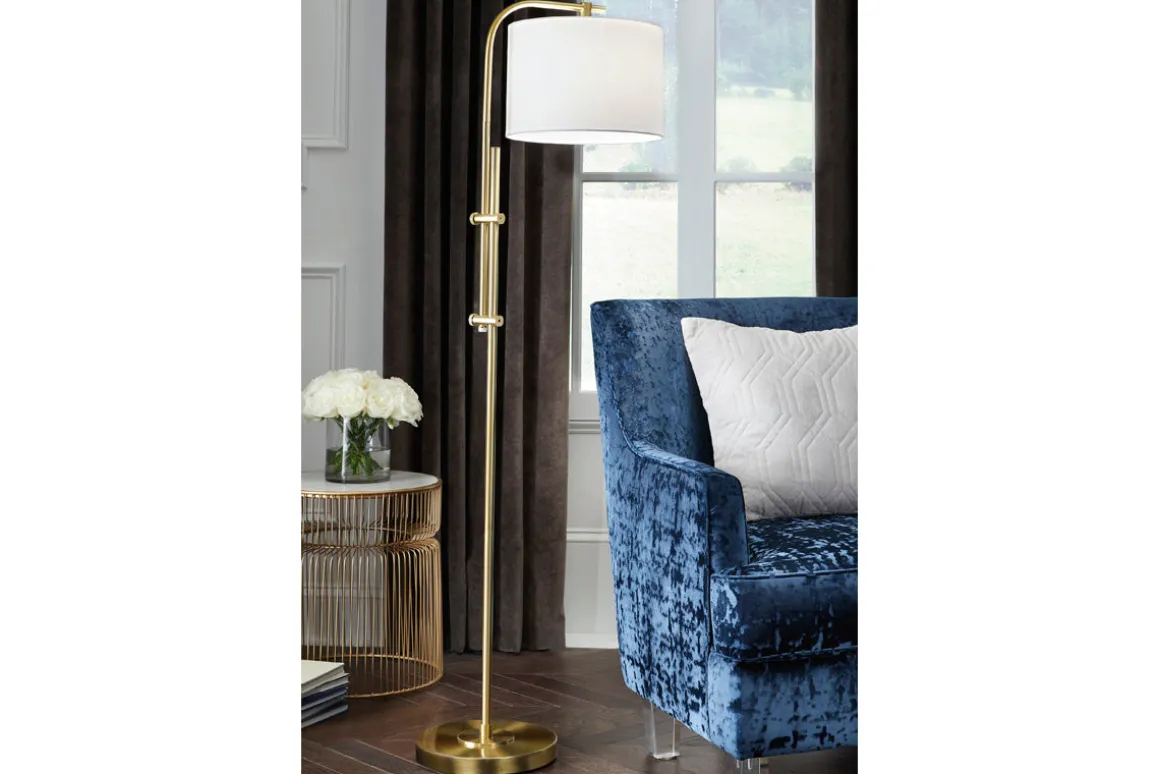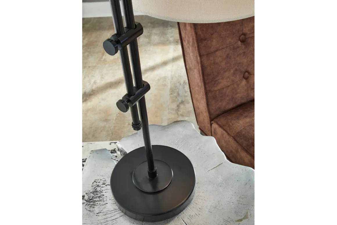 Lighten up! Brighten up your living space and create a warm and welcoming atmosphere in your home with the Baronvale Floor Lamp in Black. Constructed with casual style and simple elegance, this floor lamp looks right at home in your home. Brighten up a dark corner or use lighting to make a small room look bigger. With a stand made of metal, your Baronvale floor lamp will keep standing up tall and strong for years. Product Details: • Stands tall on a stable base • Fabric shade softens the light • Adjustable construction means your lamp will suit your space Dimensions: • 23.5”W x 13”D x 60”H