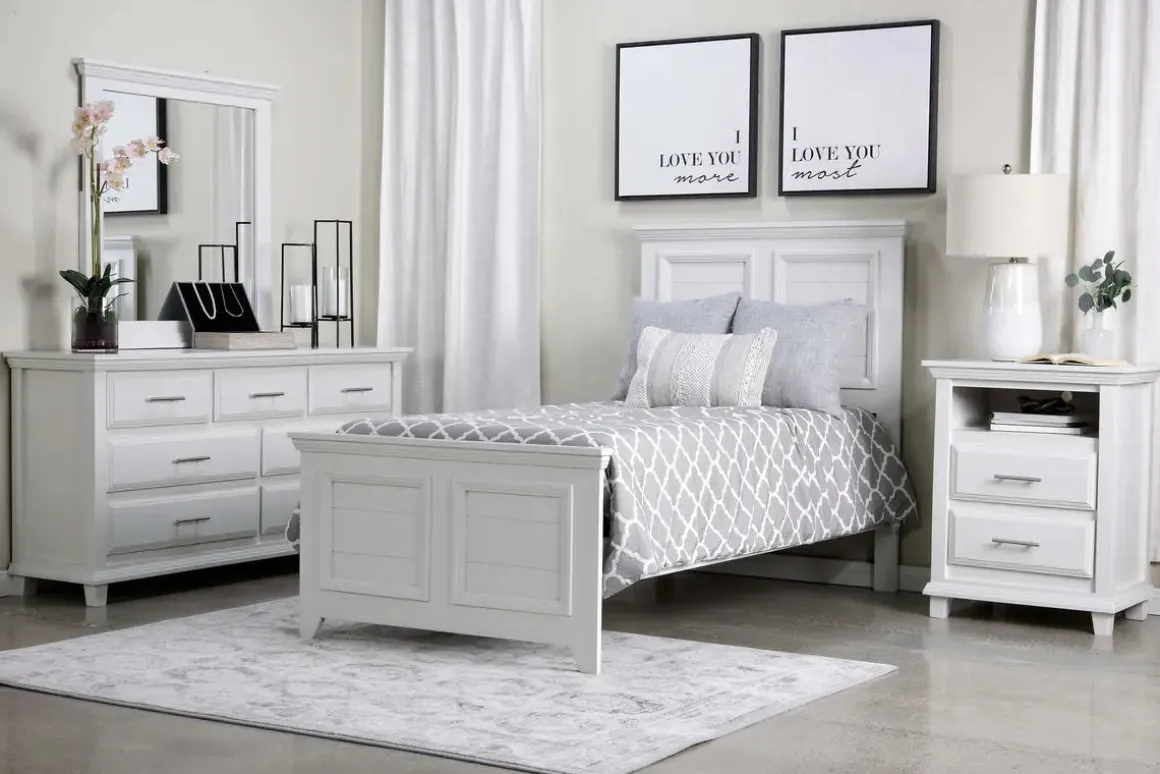 Create a cozy and charming retreat with the Bella Panel Bed in White, Twin, a farmhouse-inspired favorite designed for growing kids or compact guest rooms. Its soft stone-white finish brightens the space, while the clean panel detailing adds timeless character. Crafted for comfort and durability, this bed offers a sturdy foundation that pairs beautifully with playful bedding or layered neutrals. Whether you’re refreshing a child’s room or styling a welcoming guest nook, the Bella Bed brings warmth, quality, and a touch of rustic elegance to your home.