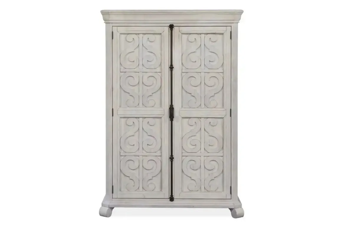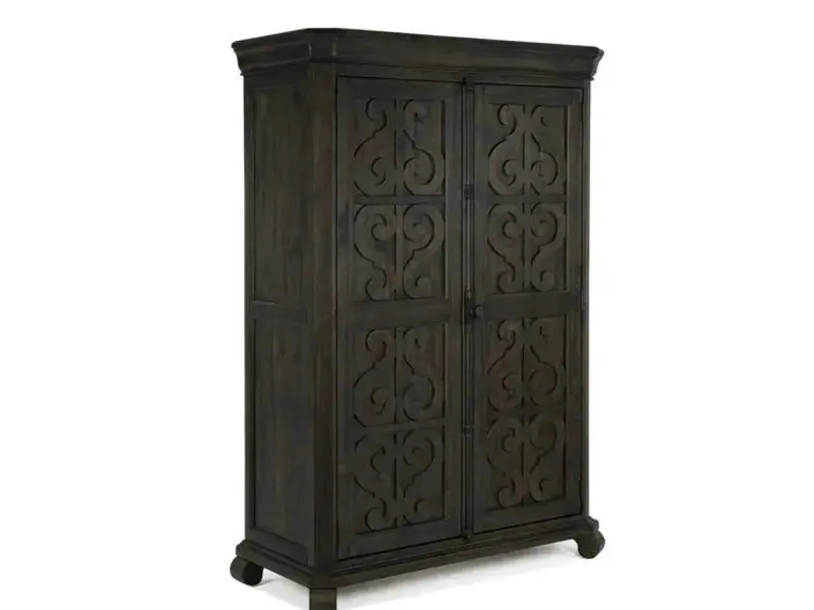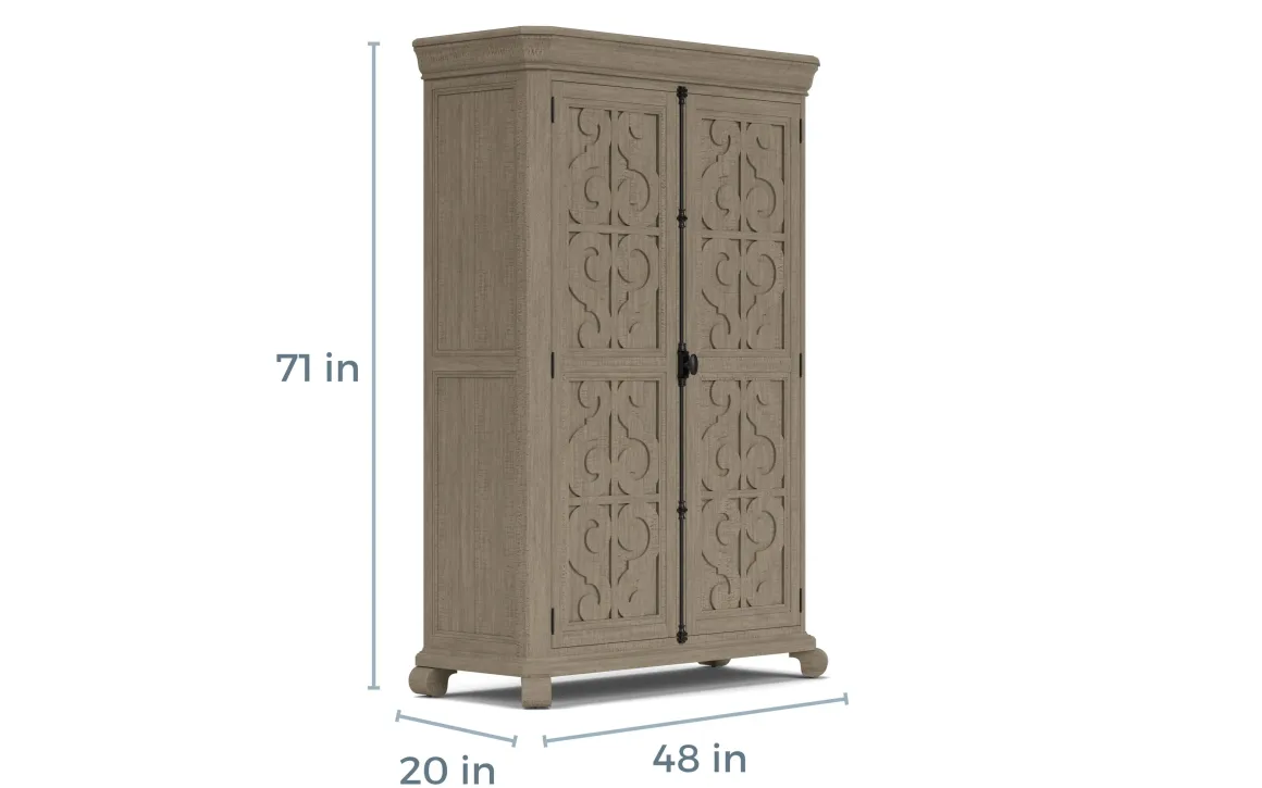 The Bellamy Armoire in Charcoal is a remarkable statement piece that combines beautiful craftsmanship with abundant storage. This large chest features handsome paneled doors, 2 adjustable wood shelves and two drawers with black matte Pewter-finished hardware.