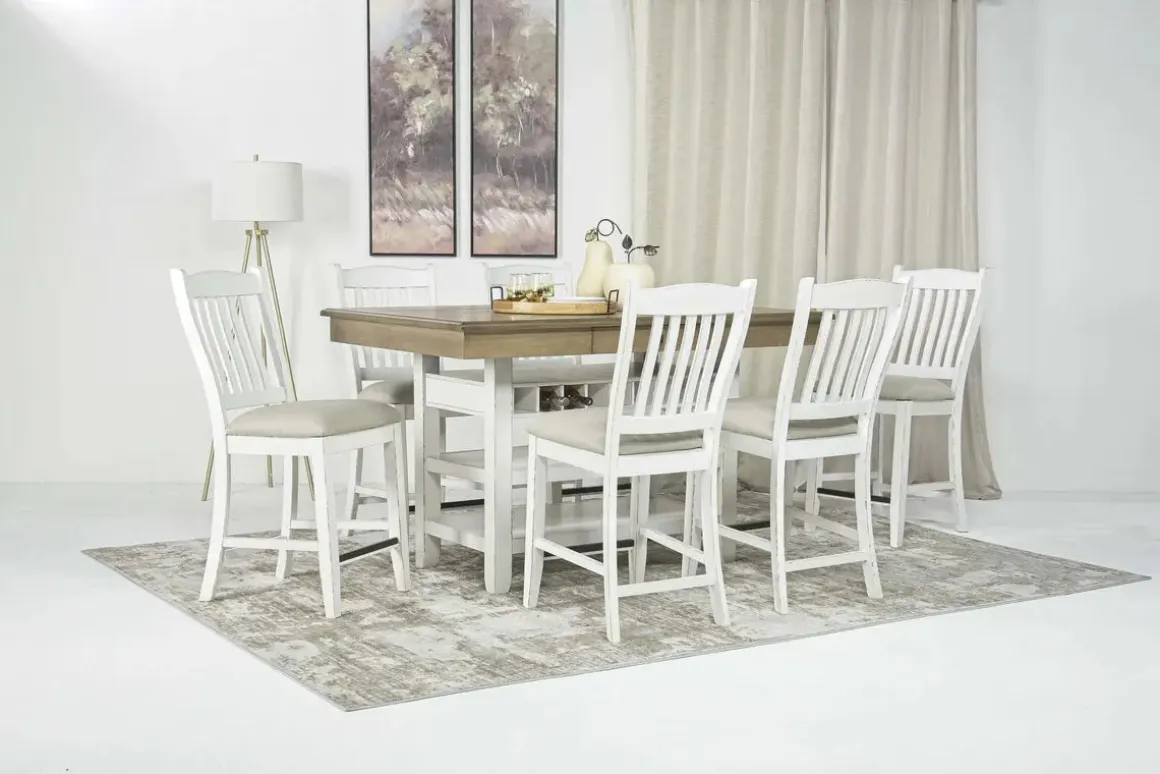 The Bellevue Counter Height Dining Table & 6 Stools in Antique White set combines beauty with practicality, making it a must-have for creating memorable dining experiences in your home. This captivating set features a traditional style dining table in a soothing antique white finish, adorned with two convenient drawers and a wine storage base, perfect for hosting gatherings. Complementing the table, the matching counter height stools boast a slat back design and plush foam seats for maximum comfort during meals. Product Details: • Pedestal table base for stability • Counter height for a cozy dining atmosphere • Sturdy wood construction and tapered square legs