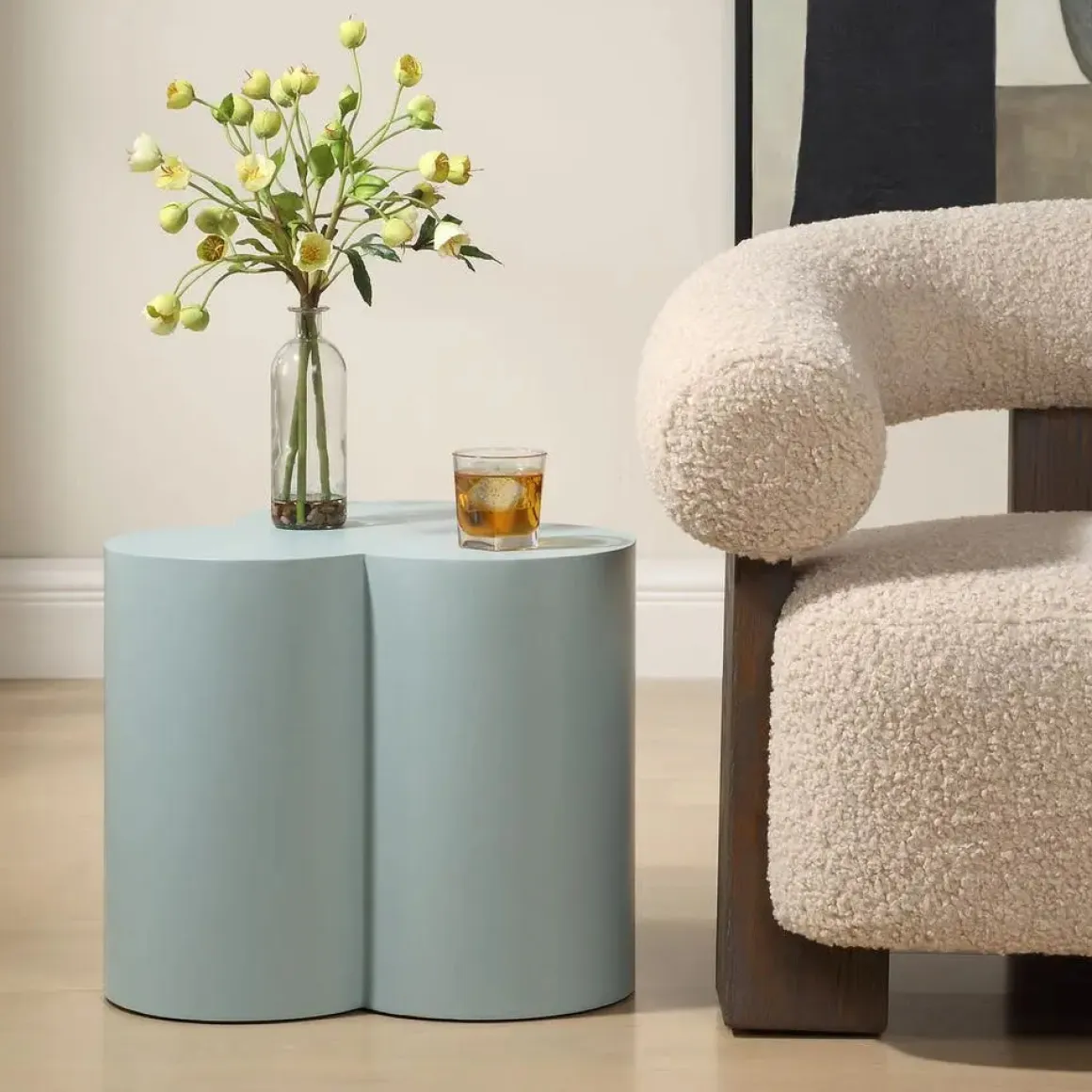 This whimsically shaped accent table, crafted from powder-coated metal in a light blue finish, adds a playful touch to your decor. Suitable for both indoor and outdoor use.