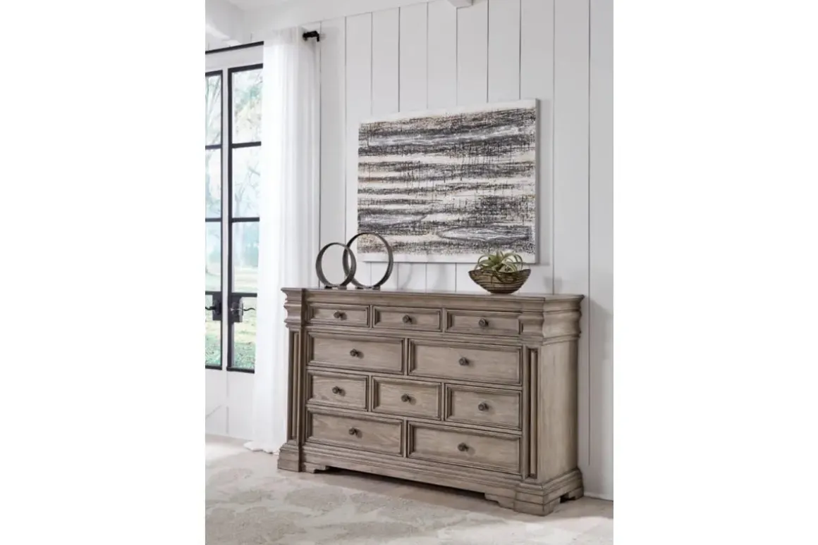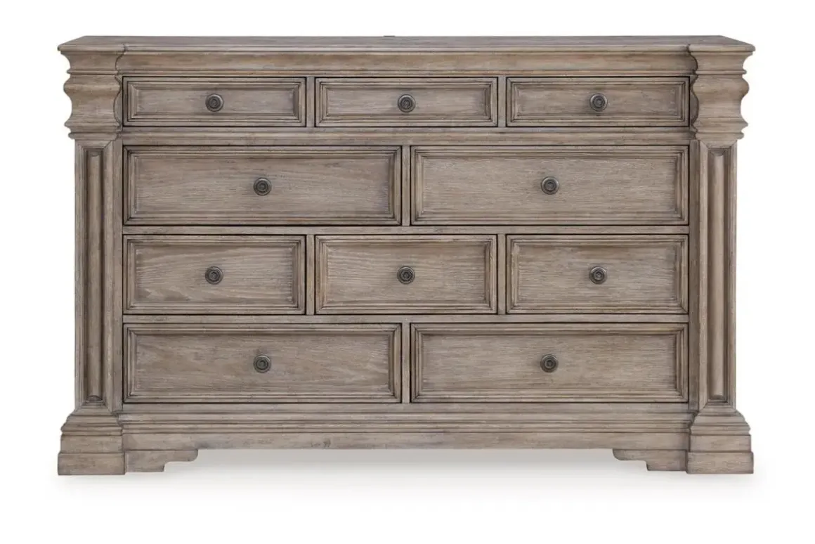 For the perfect blend of functionality and style, consider the Blairhurst Dresser in Light Grayish Brown. Featuring ten generously sized drawers, this dresser provides ample space for your clothing and accessories. The light grayish-brown finish gives it a rustic yet refined look, ideal for contemporary and traditional settings alike. With its sleek design and smooth drawer operation, this dresser makes a beautiful and practical addition to your bedroom. Product Details: • Smooth-glide drawers for easy access • Ten drawers, in various sizes, for organized bedroom storage • Rustic light grayish-brown finish for versatile styling