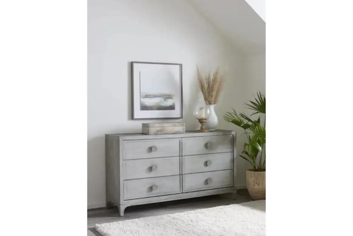 Elevate your bedroom decor with the captivating Boho Chic Dresser in Washed White. Its tasteful transitional style gives it an effortless charm that complements various decors. Adorned in a serene washed white finish, this dresser exudes a relaxed and inviting ambiance. Featuring a spacious design, it offers ample storage space, with six generously proportioned drawers that glide smoothly on full-extension drawer glides. The English dovetail drawer joint construction not only enhances stability but also adds a touch of artisanal craftsmanship.Product Details:• Crafted from sturdy pine solid wood and pine wood veneer• The washed white hue creates a striking visual contrast• Features English dovetail drawer joint construction