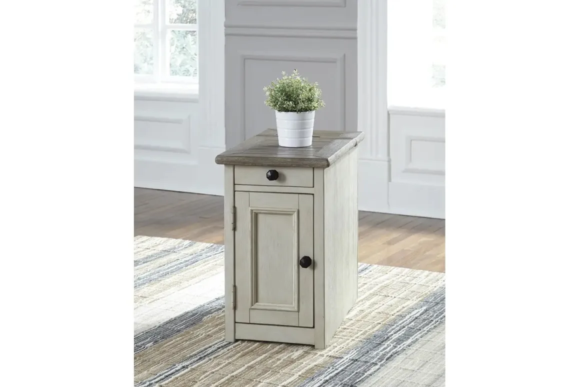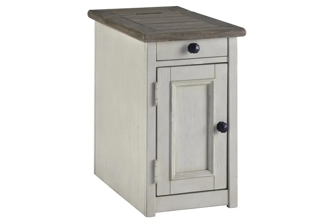 Display and contain your favorite things with the Bolanburg Chairside Table in Tan. Its textured antique white finish creates a vintage two-tone look, while outlets and USB ports provide functionality.Product Details:• Two-tone antiqued finish• Pull-out tray• Lift-top back revealing 2 electrical outlets and 2 USB charging stationsDimensions:• 14”W x 24.25”D x 23”H