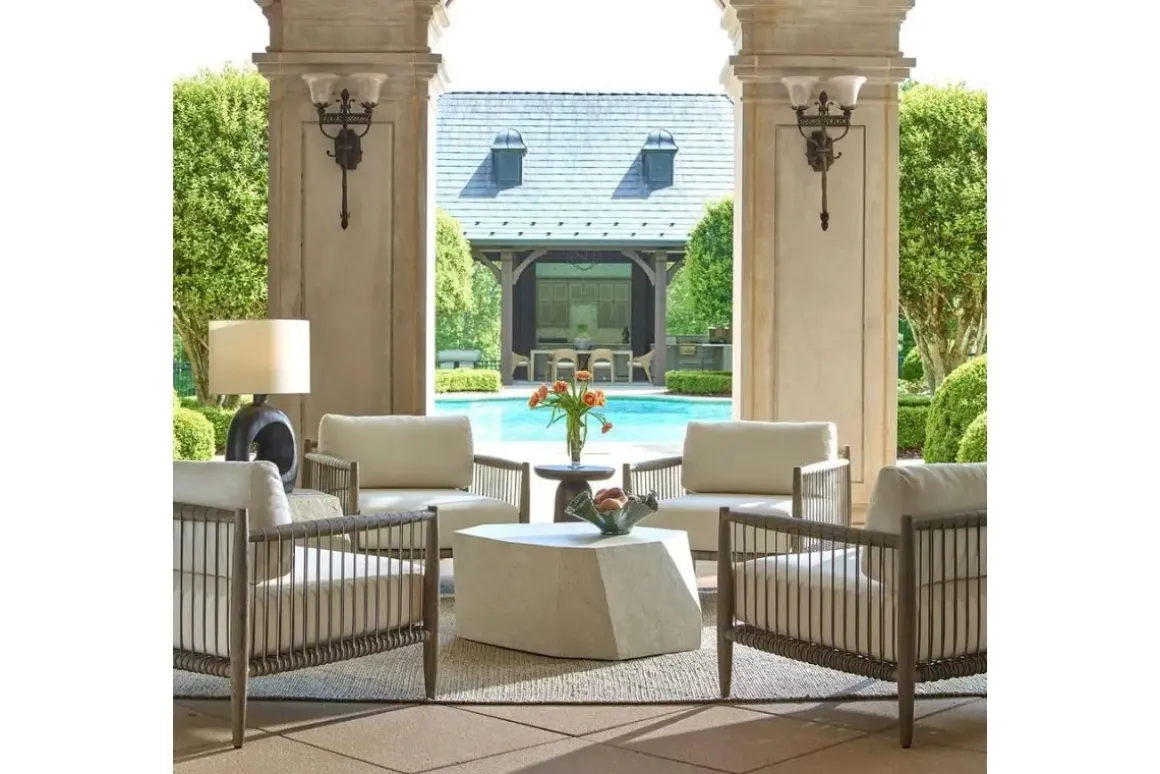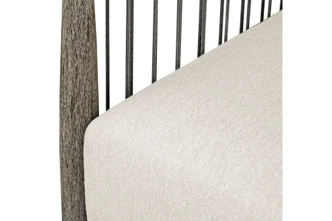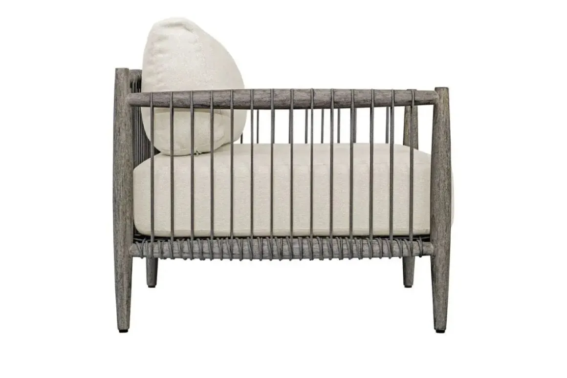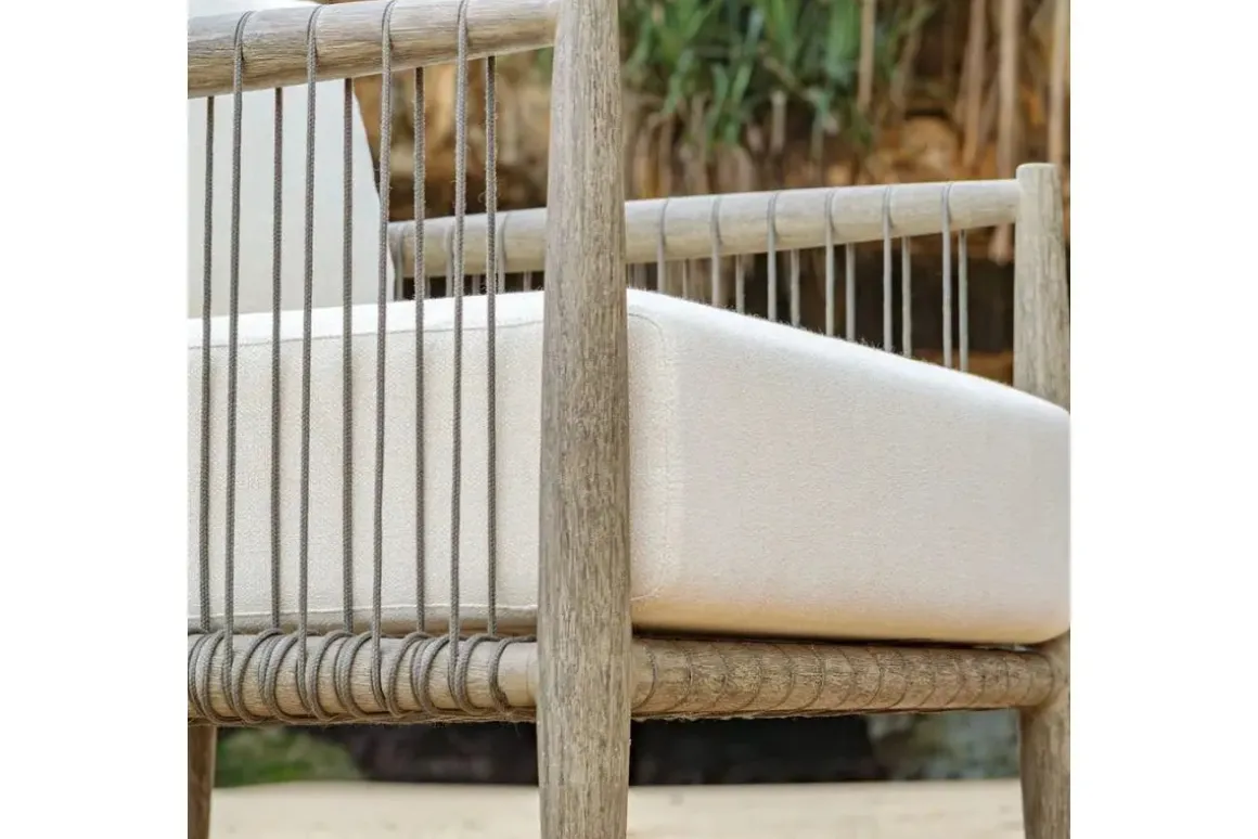 Crafted from rich, weathered dark gray mahogany and adorned with hand wrapped charcoal gray rope along the sides, the Borneo Lounge chair offers a touch of rustic elegance. Oyster white cushions in solution dyed acrylic fabric provide a comfortable contrast to the natural wood and woven accents.