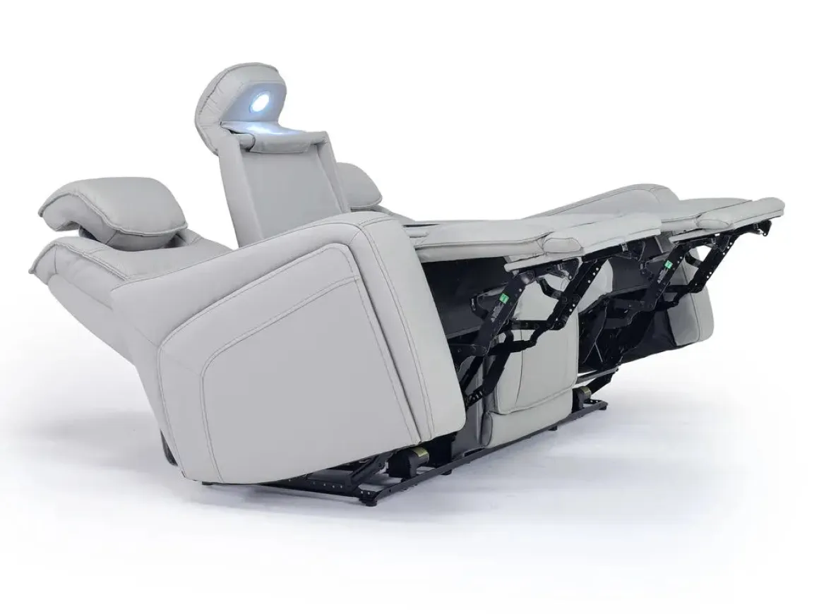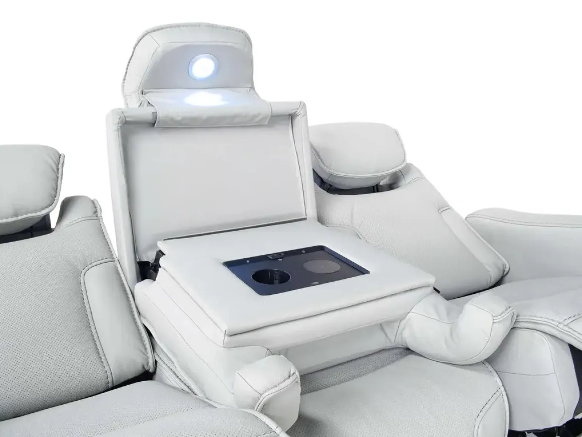 Enjoy elevated comfort and everyday convenience with the Bowden 2 Power Sofa with Drop Down Table in Blanca Light Gray Leather. This dual power reclining sofa offers personalized relaxation at both the head and foot, wrapped in a soft leather-fabric blend that brings a clean, contemporary look to your living space. The built-in drop-down table adds functionality with space for drinks, devices, or snacks—perfect for movie nights or casual gatherings. With a tight back design and semi-attached cushions, the Bowden sofa blends sleek styling with family-friendly features that make it a standout in any home.