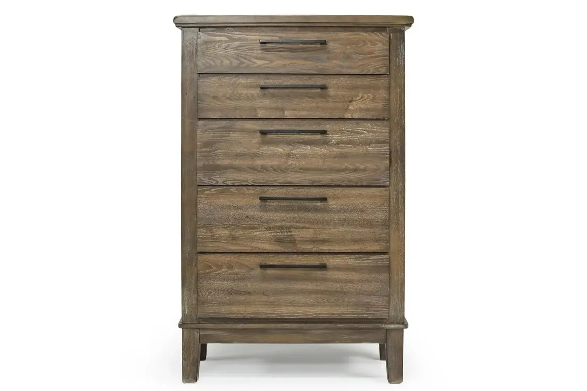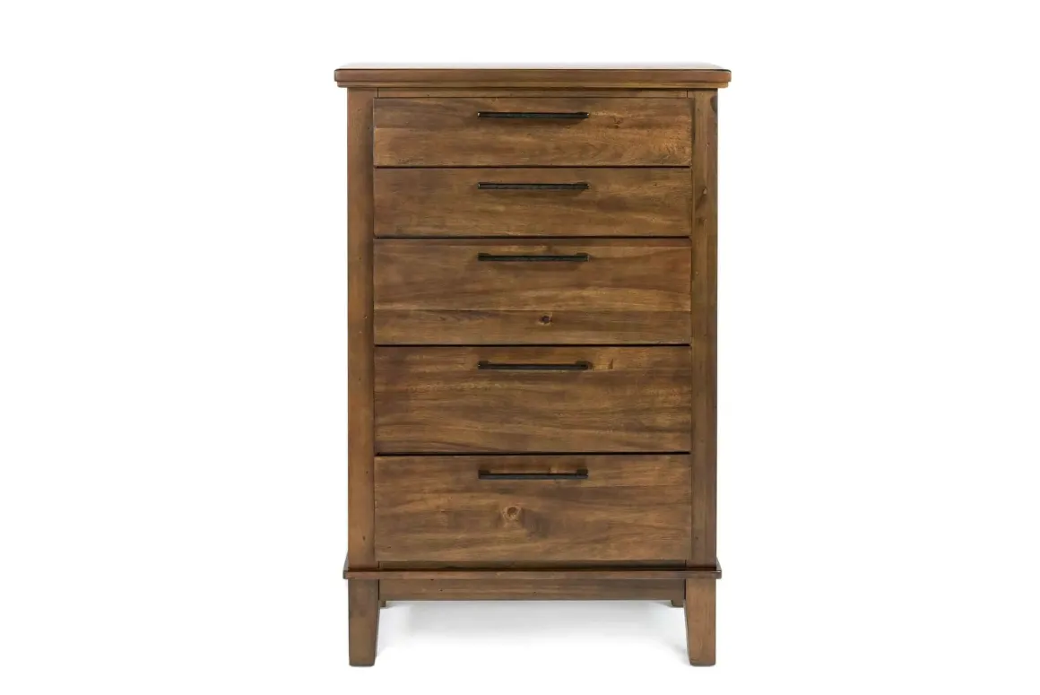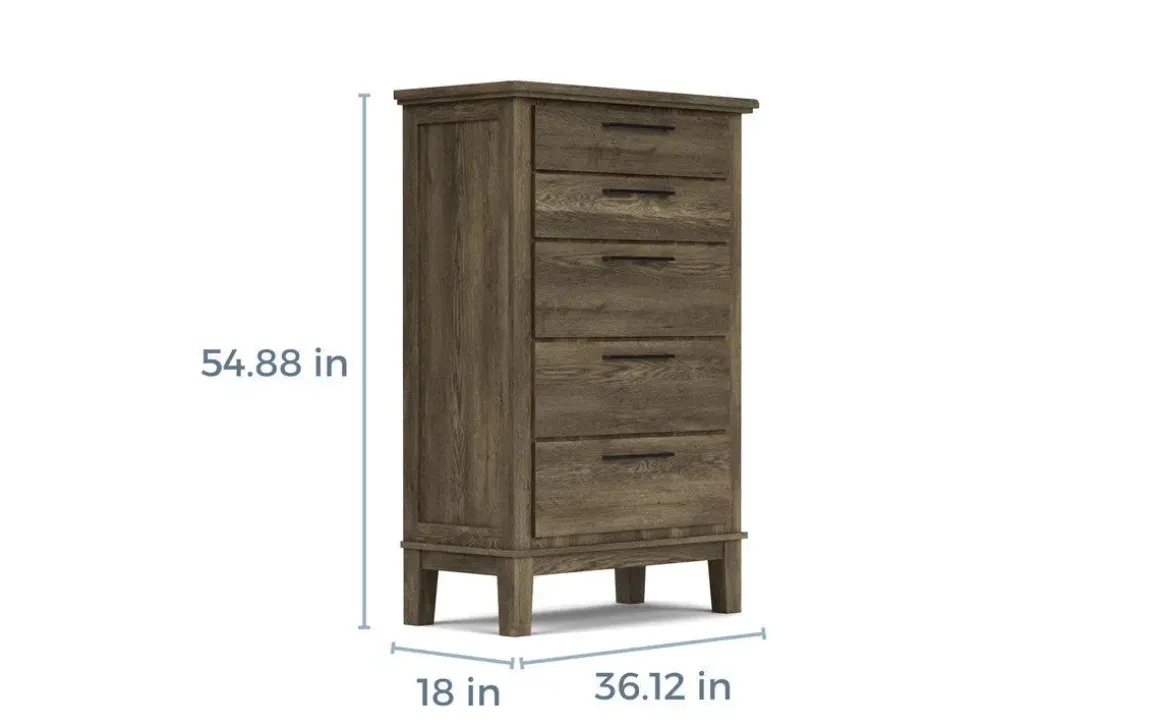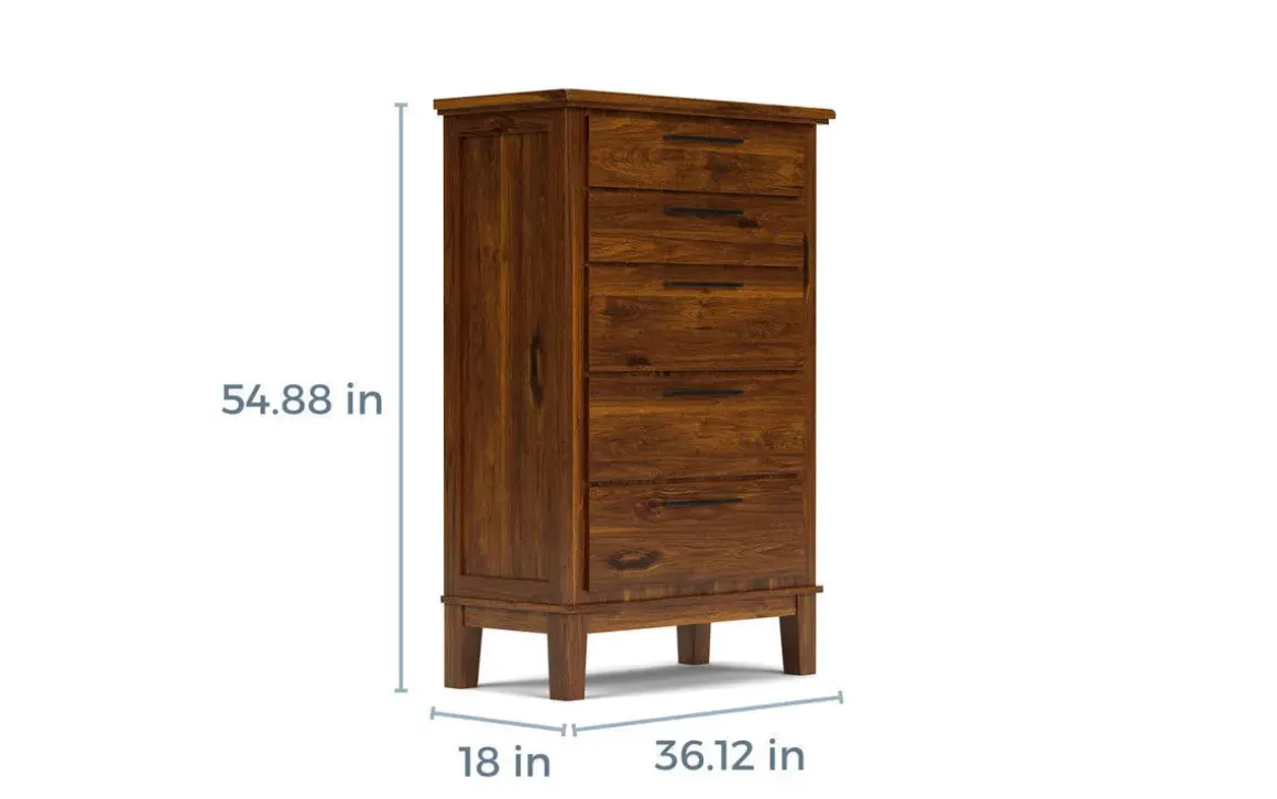 The Cagney Chest in Brown pairs a modern, streamlined design with a rich chestnut finish. Durably crafted with ball-bearing drawer glides and dovetail joints, this spacious chest is finished with felt-lined top drawers and sleek metal hardware.