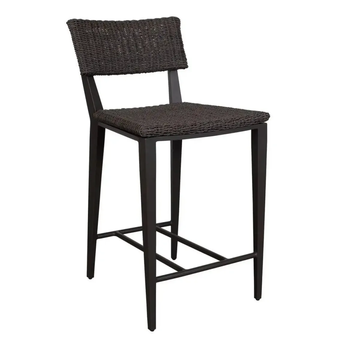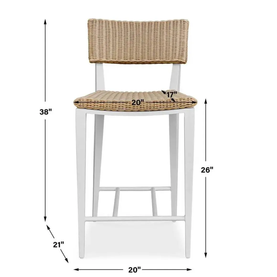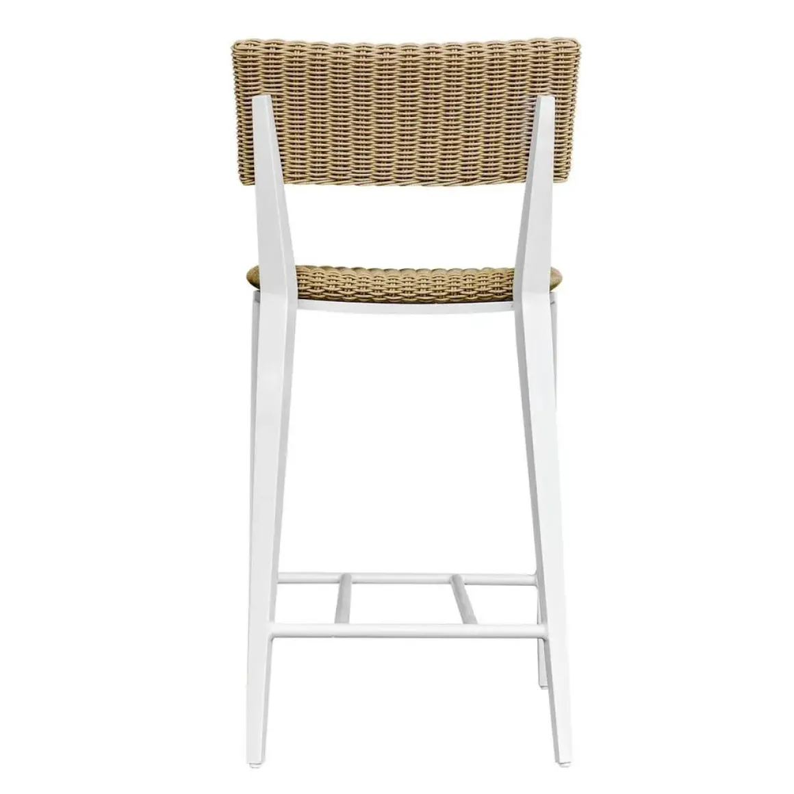 The Calbas counter stool perfectly blends style and comfort. The crisp white, powder coated aluminum frame and hand wrapped, honey toned all-weather wicker create a harmonious look that will enhance any outdoor setting.
