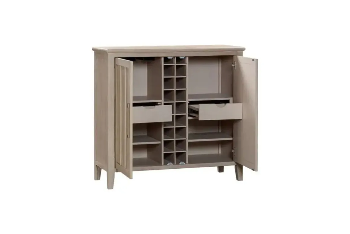 Add a touch of sophistication and storage to your home with the Camden Bar Cart in Chai. This beautiful cabinet combines classic design elements with modern functionality, making it a perfect choice for entertaining or simply storing your favorite beverages. This piece features two doors that open to reveal ample storage space for your liquor bottles, glassware, and barware. Product Details: • The warm chai finish offers a sense of timeless elegance and blends seamlessly with various color schemes • Features an internal stemware rack for hanging your delicate glasses, adjustable shelves for flexible storage, and two drawers for storing bar tools, napkins, or coasters • Brushed nickel hardware provides a touch of modern detail and complements the warm finish of the cabinet