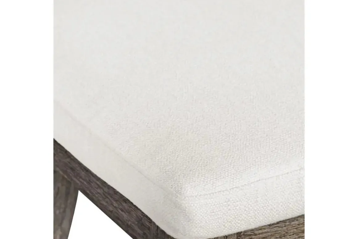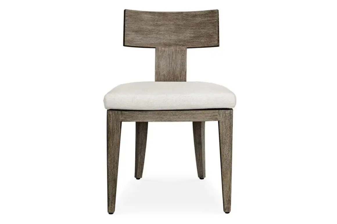 With durability for the outdoors in mind, the Cellini dining chair features a gracefully curved mahogany wood frame in a weathered gray finish with wire-brushed details. The plush cushion is upholstered in oyster white solution dyed acrylic fabric that is constructed to withstand the moisture and dirt that comes with outdoor use.