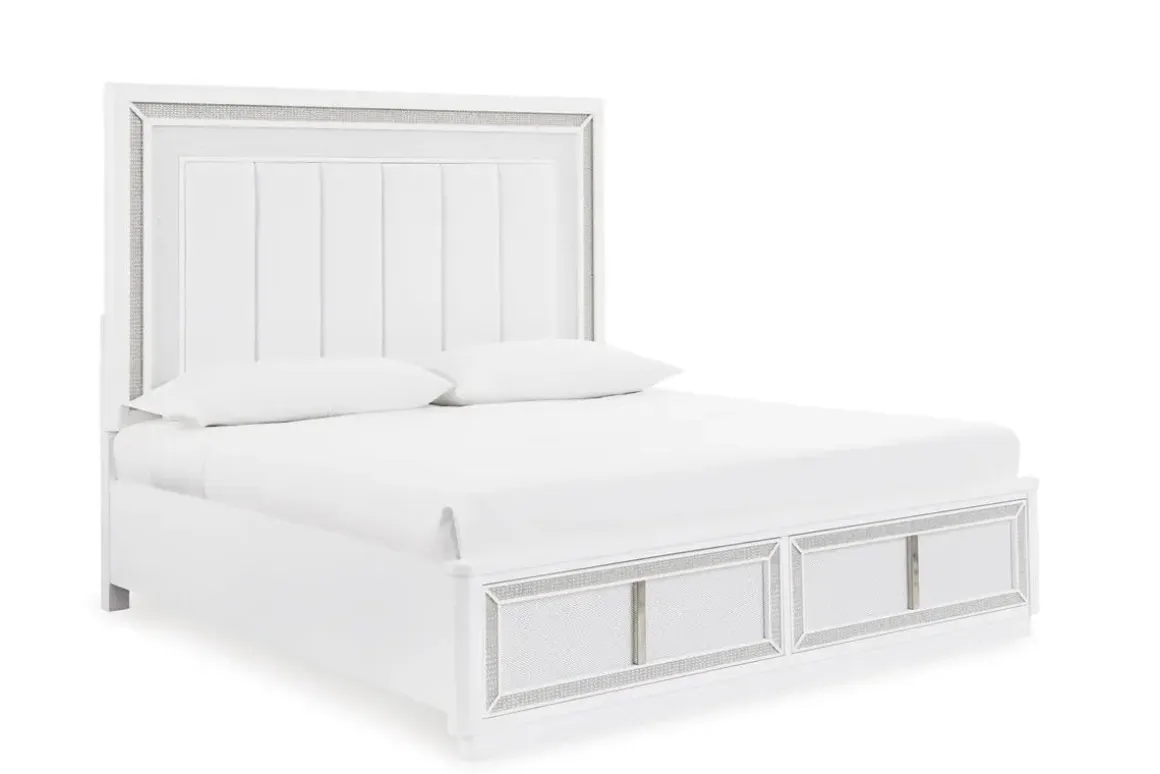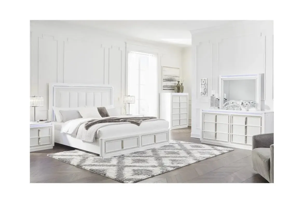The Chalanna Storage Bed, Dresser, Mirror & Nightstand in White, Queen offers a luxurious blend of modern design and practical functionality, transforming your bedroom into a sophisticated retreat. The bright white lacquer finish is beautifully accented by rhinestone-framed details and textured drawer fronts, adding a touch of contemporary glamour. The bed features an inset channeled headboard upholstered in white faux leather and two deep storage drawers in the footboard for added convenience. Built-in LED lighting with a 3-way dimmer switch highlights the headboard, mirror, and upper valances of each piece.Product Details:• Bright white lacquer finish with rhinestone accents and textured drawer fronts• Fully finished drawer boxes with English dovetail construction• Contemporary metal bar pulls set vertically for a modern touch