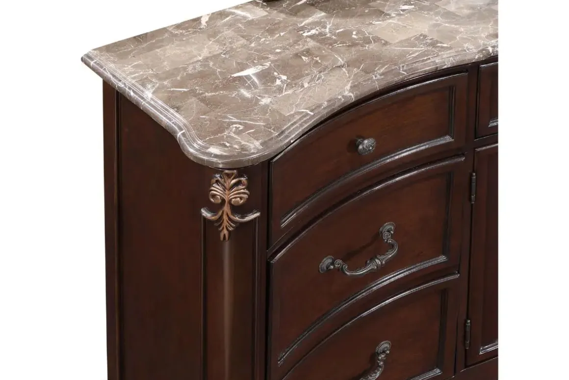 Introduce an aura of sophistication and traditional charm to your bedroom with the Constantine Dresser in Cherry. This exquisite piece seamlessly blends timeless design with exceptional functionality, creating a luxurious and organized haven for your clothes and belongings. With its timeless design, exceptional craftsmanship, and ample storage space, it is a perfect choice for those seeking to add a touch of luxury and functionality to their bedroom. Product Details: • Warm cherry finish • Generously sized drawers • Luxurious marble top