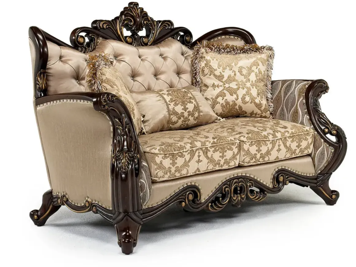 A matched pair in contrasts of delicate details and solid construction, the Constantine Sofa & Loveseat in Gold transport you to eras of timeless style and opulence. The satin finish of the upholstery as well as the floral designs on the cushions and pillows add to the rich character of this furniture. Experience luxurious and comfortable seating when you choose this set for your living or sitting room.Product Details:• Tufted diamond back design• Metallic gold accents on the frames• Each piece includes two decorative pillowsDimensions:• Sofa: 94”W x 37”D x 46.75”H• Loveseat: 69”W x 37”D x 48”H