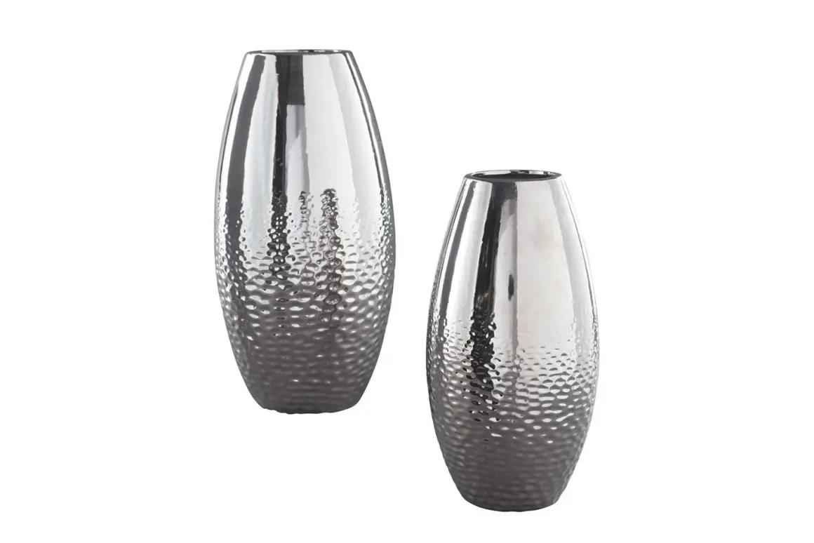 Add subtle glam with the Dinesh Ceramic Vases, Set of 2, reflecting your eclectic eye for design. Textural pattern gracing the sides of the vases evokes ripples of water. Spectacular silvertone glazed finish adds a splash of sheen and shine.Product Details:• Made of glazed ceramic with silvertone finish• Clean with a soft, dry cloth• Not water safeDimensions:• Large vase: 8”W x 8”D x 16”H• Small vase: 6.25”W x 6.25”D x 12”H