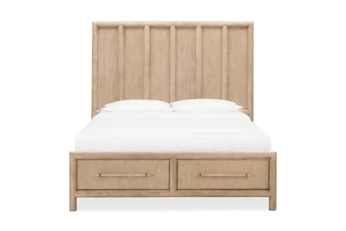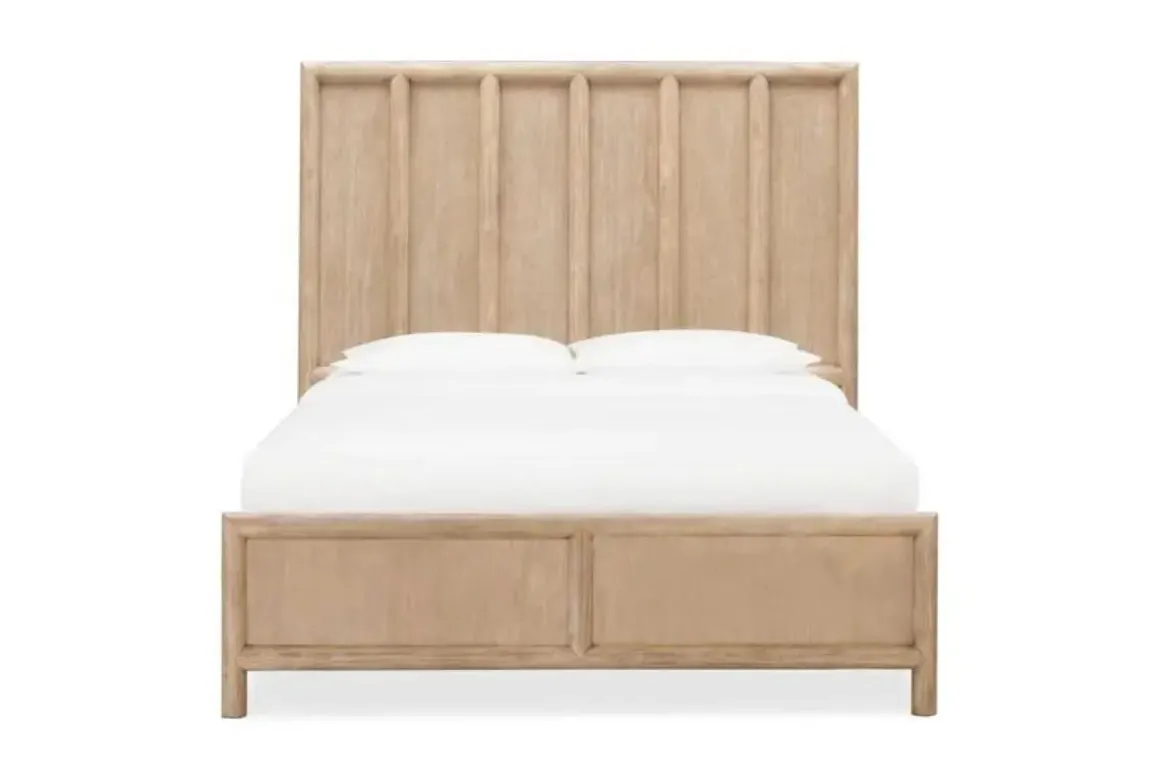 The Dorsey Panel Bed in Granola, Queen, will bring a touch of rustic warmth and modern design to your bedroom. The bed frame features a clean-lined silhouette and thick, rounded wood framing, offering a contemporary aesthetic. The Granola finish, with its light brown hues and subtle wood grain variations, adds a touch of rustic charm.