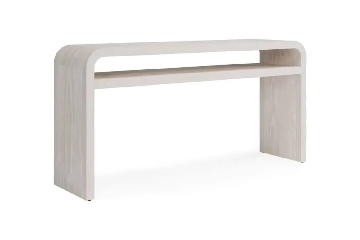 The Drake Console Table in Sugar blends classic minimalist lines with waterfall edges in a striking unexpected arrangement. Ash wood veneer and solid hardwood surfaces are gently wire brushed to enhance the wood‘s natural texture and finished in a modern white wash for a look that‘s at once modern, coastal and cottage.