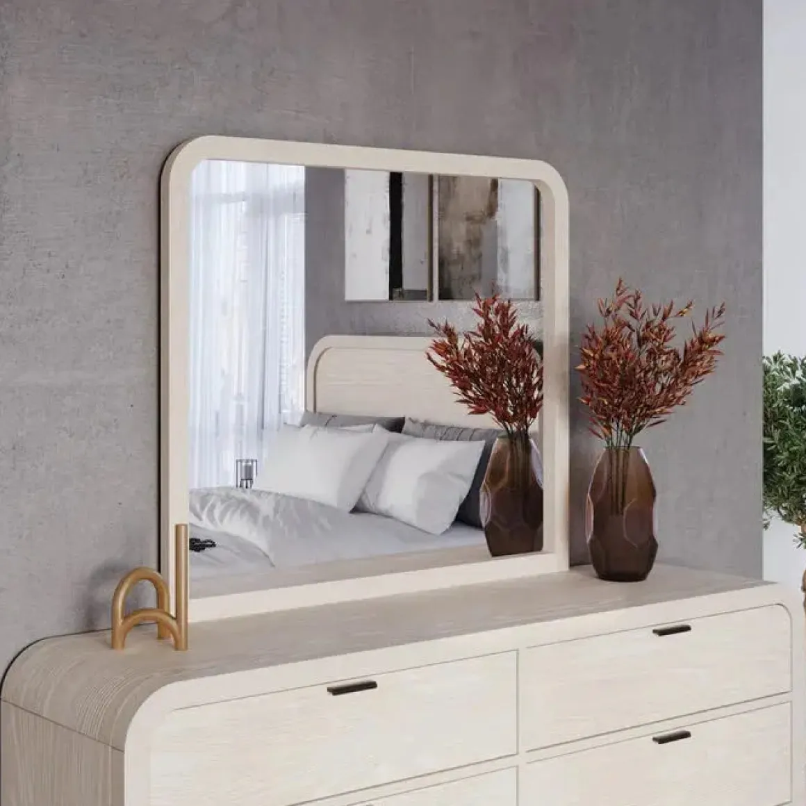 The Drake Mirror in Sugar blends classic minimalist lines with waterfall edges in a striking unexpected arrangement. Ash wood veneer and solid hardwood surfaces are gently wire brushed to enhance the wood’s natural texture and finished in a modern white wash for a look that’s at once modern, coastal and cottage.