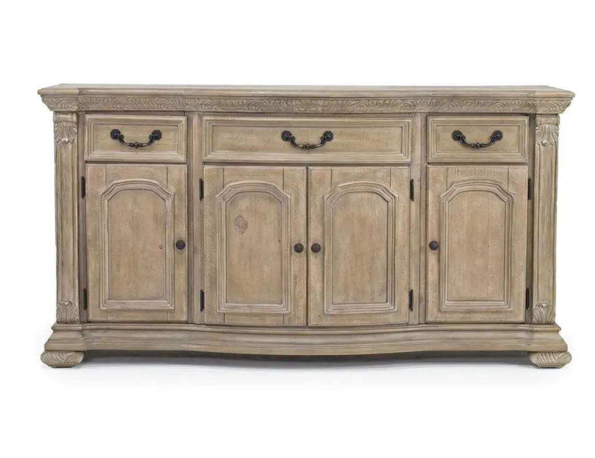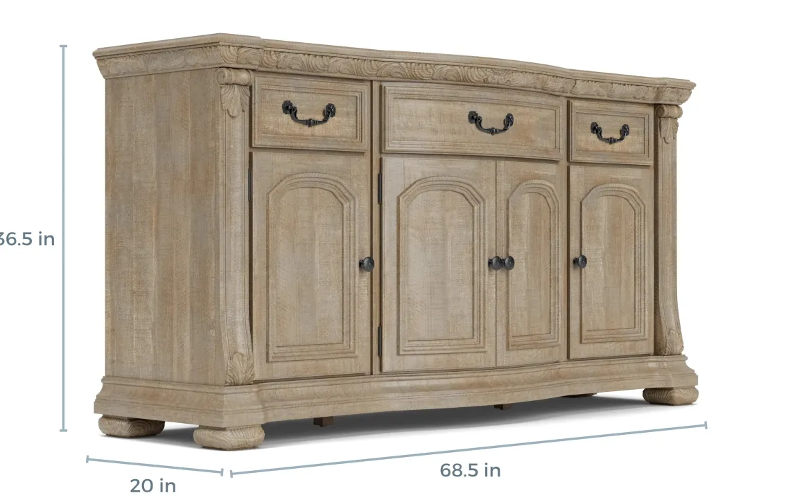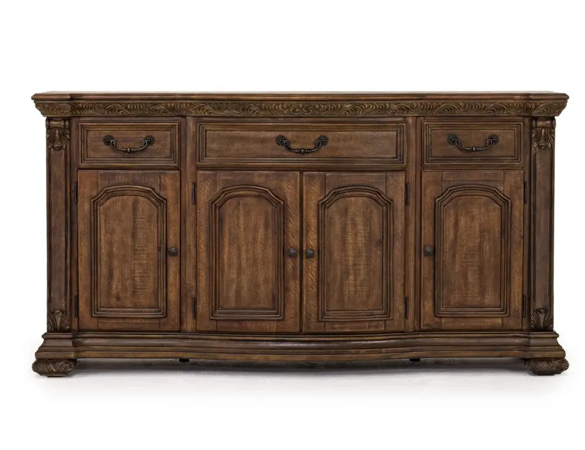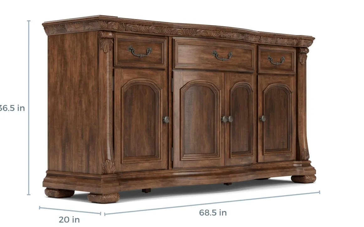 The Durango Buffet in Willadeene is a classic solid pine wood piece that would make the perfect addition to a dining room or other space in your home. This elegant piece, with its Willadeene Brown finish and decorative details, is as functional as it is beautiful. It has three felt-lined top drawers, two center cabinet doors, and two side doors with an adjustable shelf to meet all your storage needs.