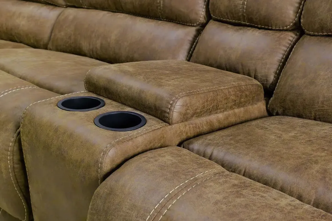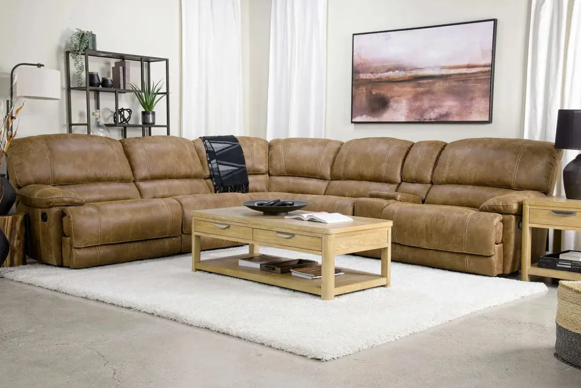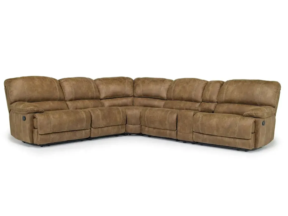 Stretch out and settle in with the Dusty 6 Piece Reclining Sectional in Bonanza Silt—a spacious and stylish solution for family lounging. This sectional features manual reclining seats, foam cushioning, and a tight back design that offers supportive comfort without sacrificing a clean silhouette. The rich Bonanza Silt upholstery adds warmth and texture to your living space, while the console provides convenient storage and cup holders for movie nights and everyday relaxation. Whether you’re hosting guests or enjoying quiet time, the Dusty sectional delivers comfort and value with a transitional flair.