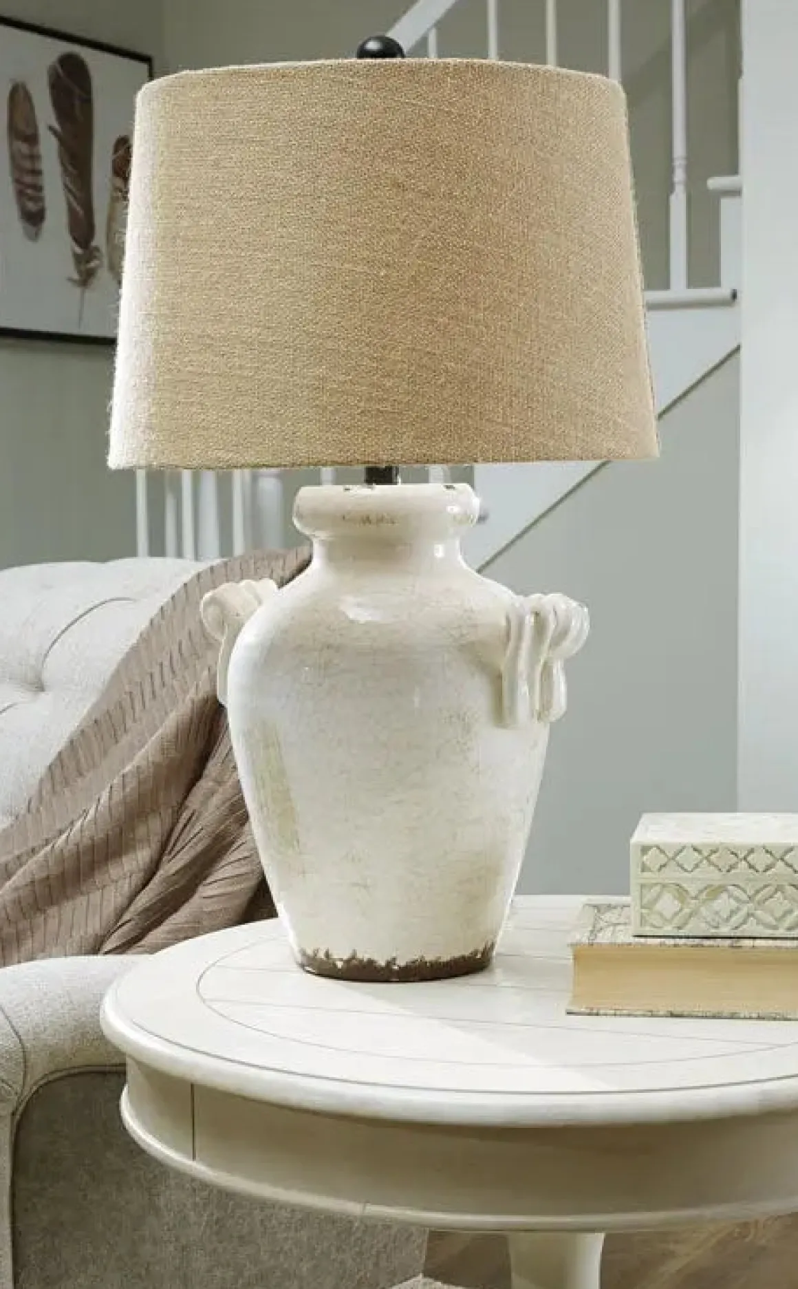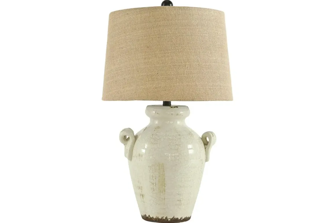 The Emelda Table Lamp offers vintage-inspired style. The antiqued cream glazed ceramic highlights the crackle detail work in the base. Complete with a tattered fabric lampshade. The faux handles add a beautiful silhouette for and cottage or farmhouse styled-home.