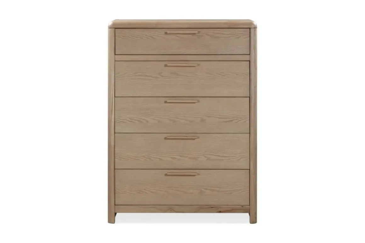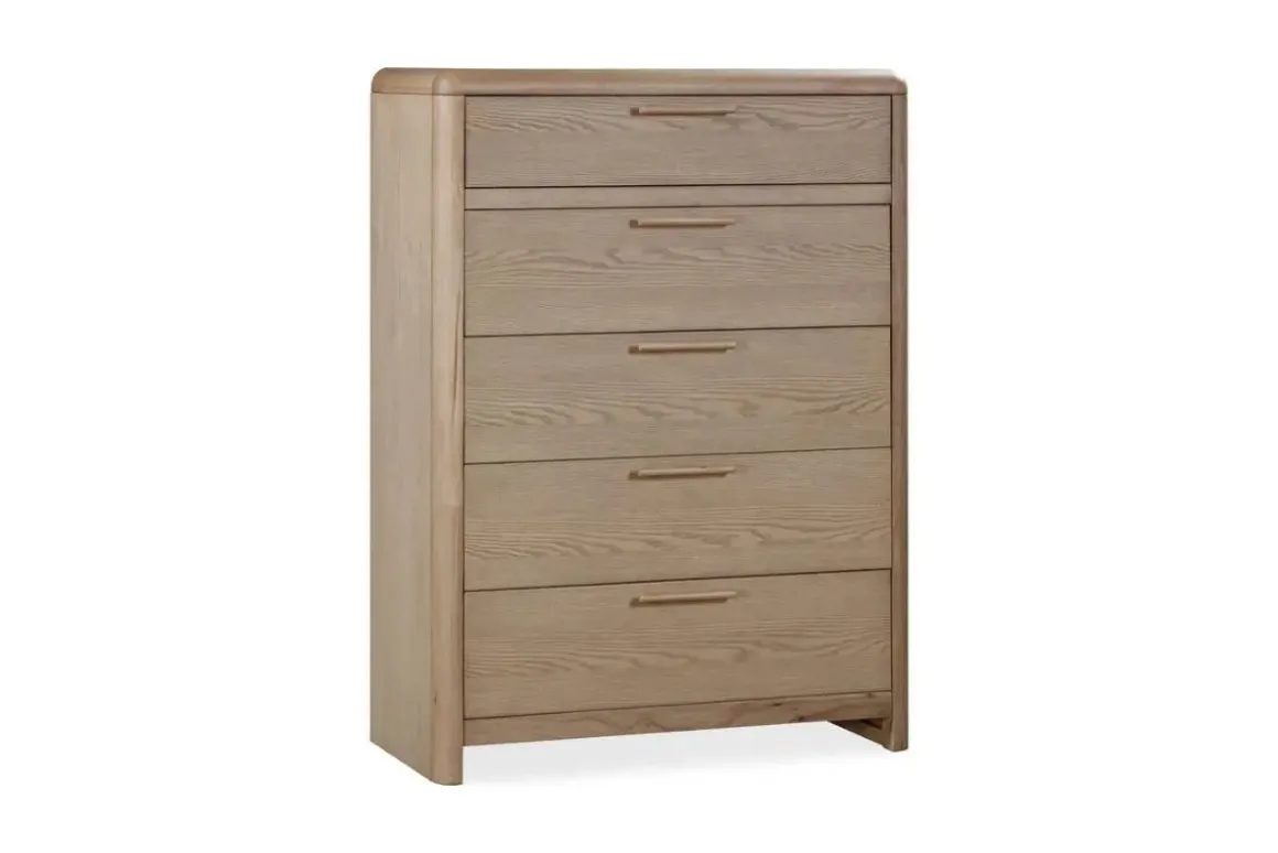Designed to harmonize with your space, the Furano 5 Drawer Chest in Ginger seamlessly blends soft edges, natural materials, and thoughtful craftsmanship. Ash wood veneer in a soft ginger root finish takes center stage, showcasing natural wood grain formed over decades.