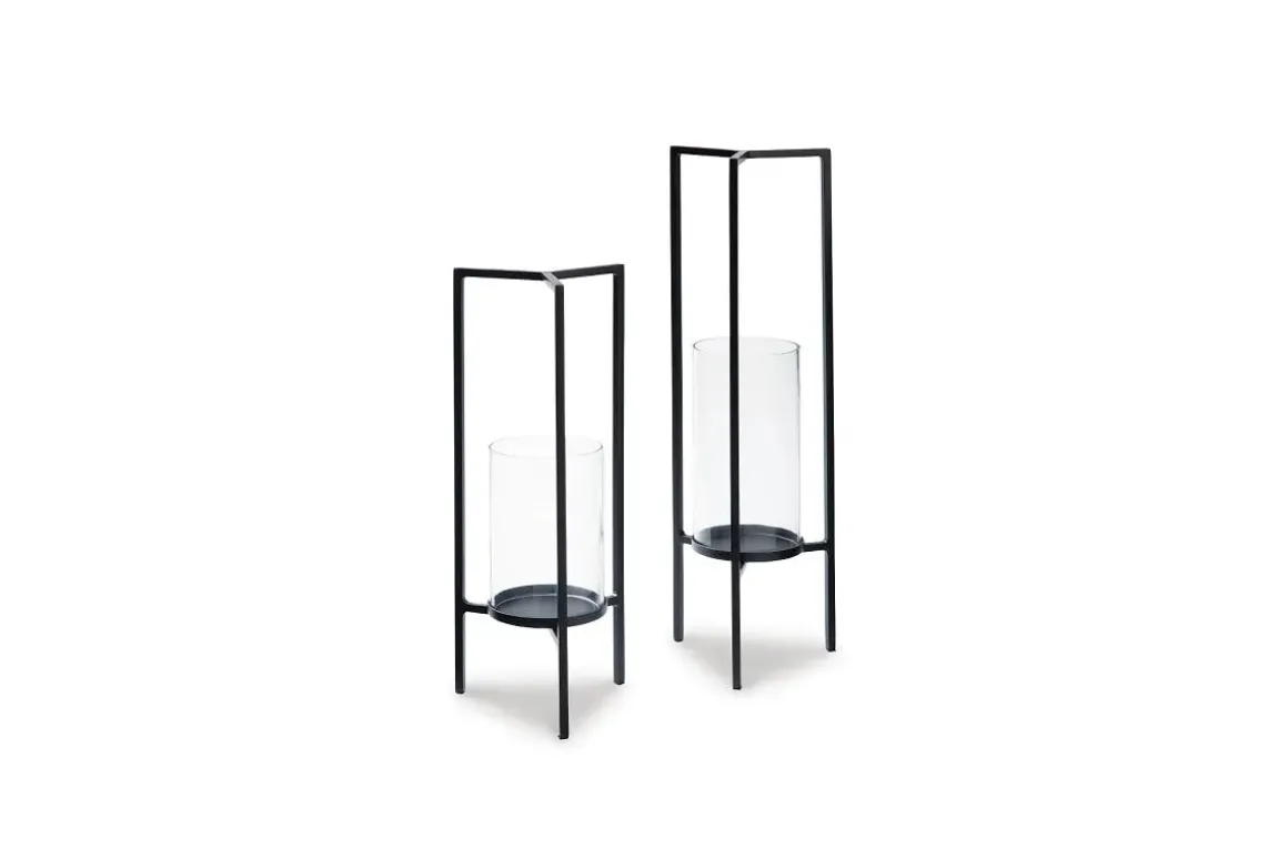If you love modern lines and industrial-chic styles, these Ginette Candleholders, Set of 2, will become the perfect finishing touch in your living or dining room. They are crafted of a black metal and clear glass, so they look simple and slightly utilitarian. The candleholder bases are the same width, 6” x 6”, but the heights are different. The shorter candleholder is 16” tall, the other is 20”. You could use several sets of these throughout your home to bring a sense of design flow from room to room.Product Details:• Staggered heights, these candleholders aren’t identical• Constructed of megal and glass• Minimalist, utilitarian, industrial-chic design style