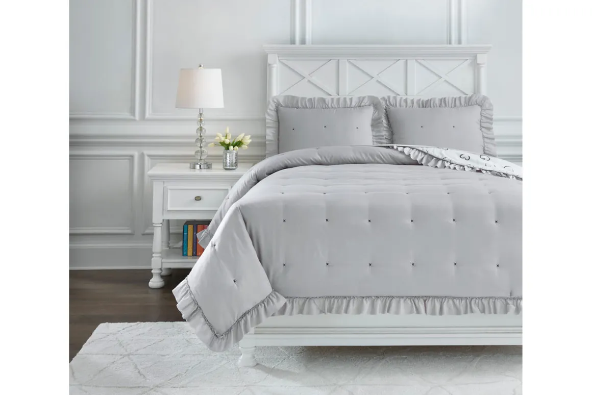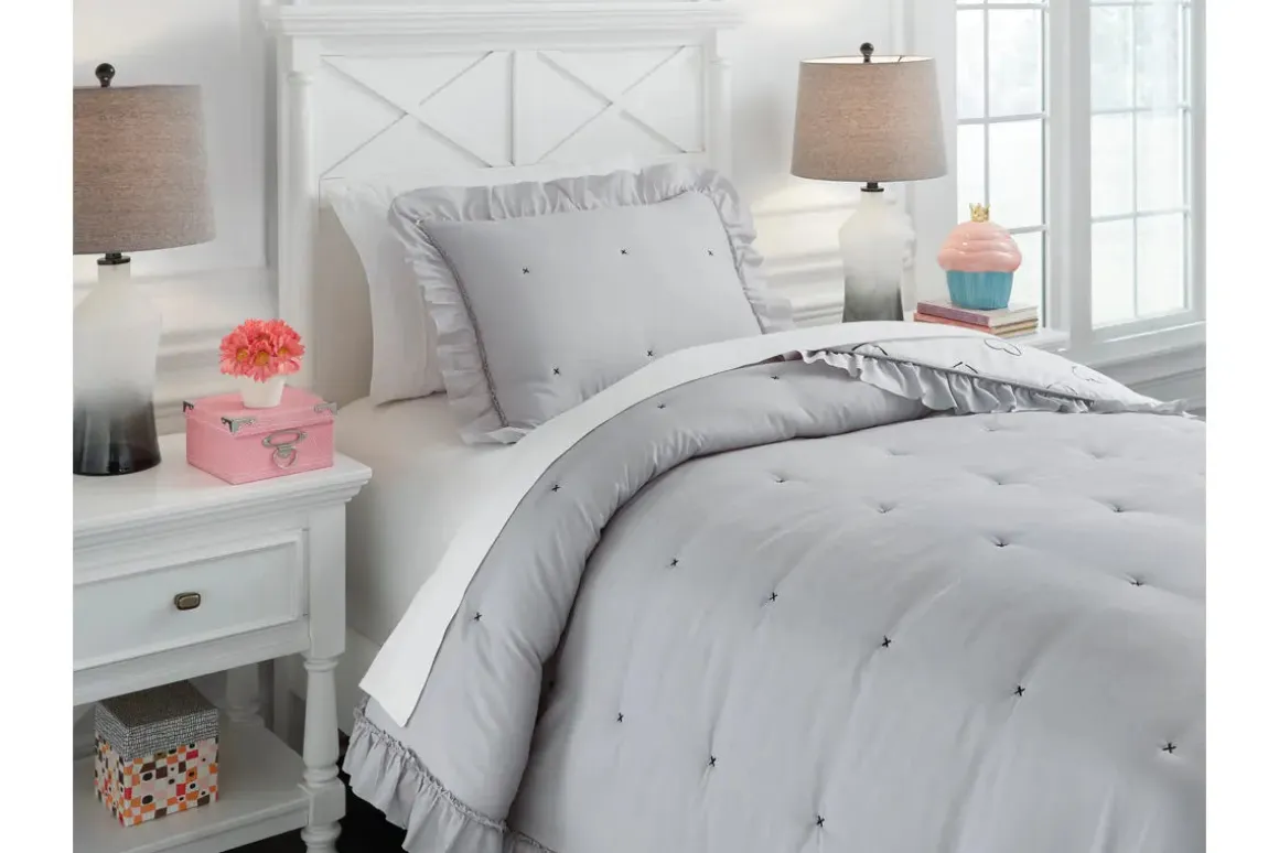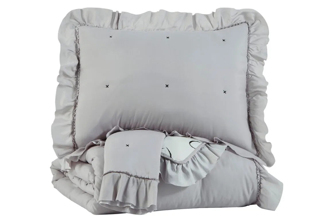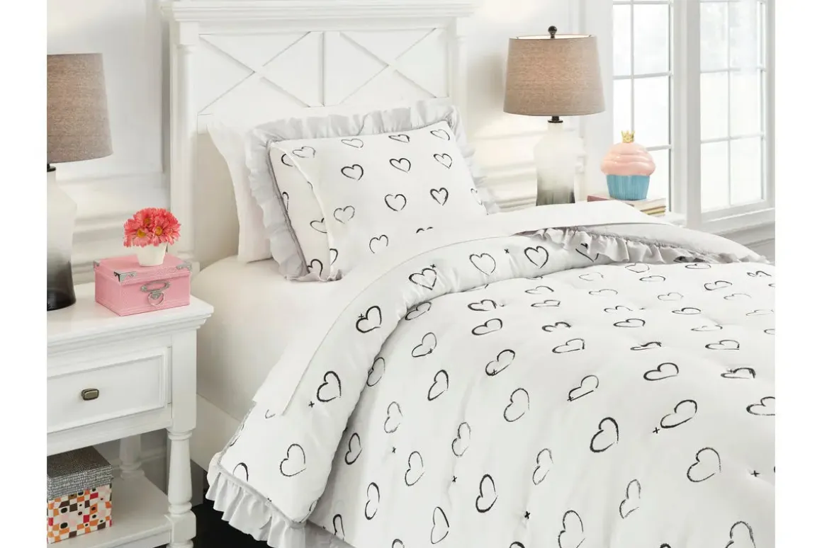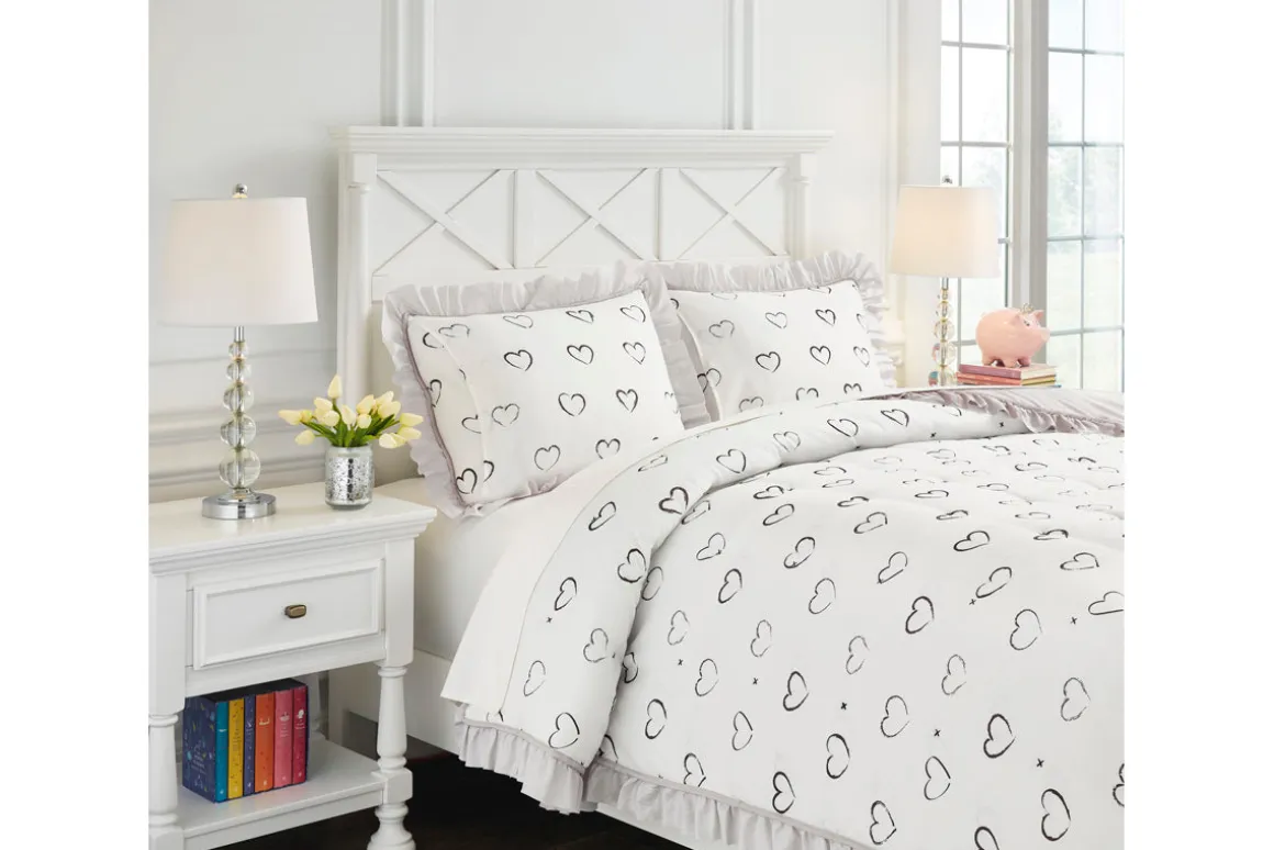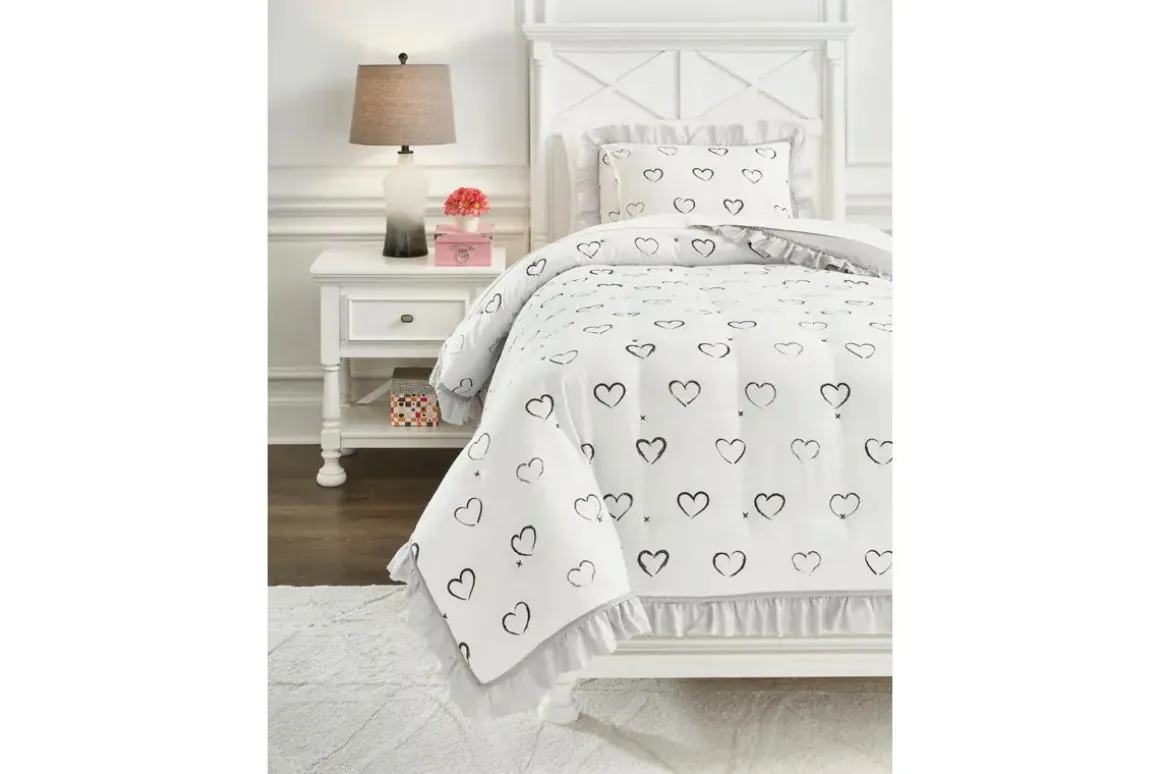 Refresh and update the look of your room in one fell swoop! Finish your room with a Hartlen 2 Piece Coverlet Set, Twin and make the whole place look new. Fully reversible in gray and white with a solid color side and a patterned side featuring sweet repeating hearts. Change up your look with a swish of the coverlet and Bam! It looks like a new set. You’ll always have a set to match your style.