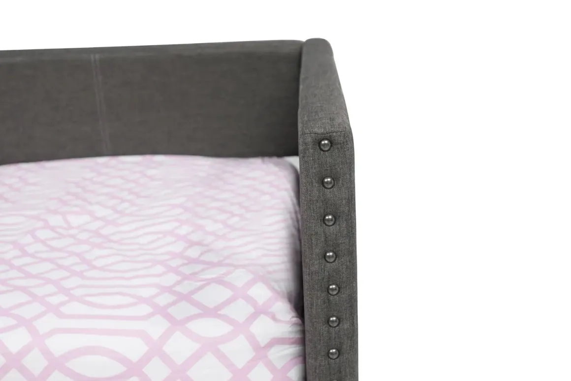 The Heather Daybed in Gray, Twin with trundle, is the perfect piece for lounging, with ample space for sleep. Transitional, modern, and contemporary, the creative design of this daybed allows it to fit into any number of areas in your home. Upholstered in a stylish polyester gray fabric, this versatile daybed features a twin-size under-bed trundle that pulls out to accommodate additional sleep space needs. Product Details: • Features a full slat design for top and trundle • Nailhead accents add extra style and sophistication • Trundle bed offers easy mobility