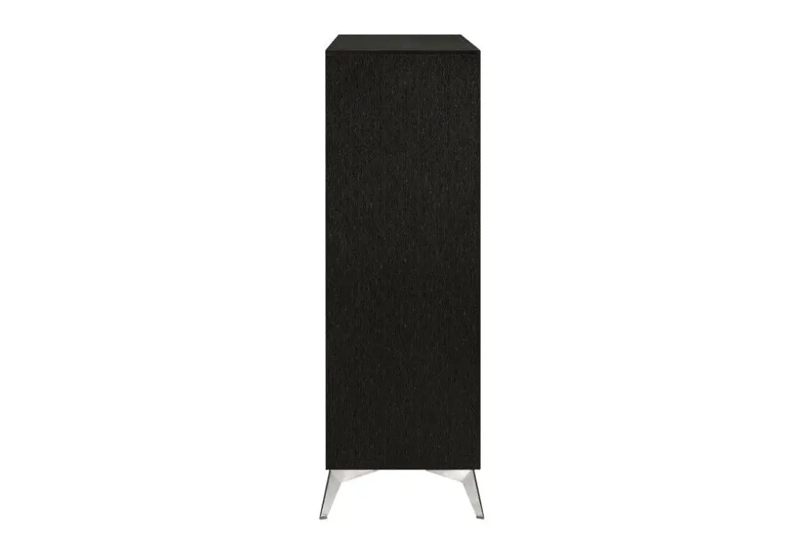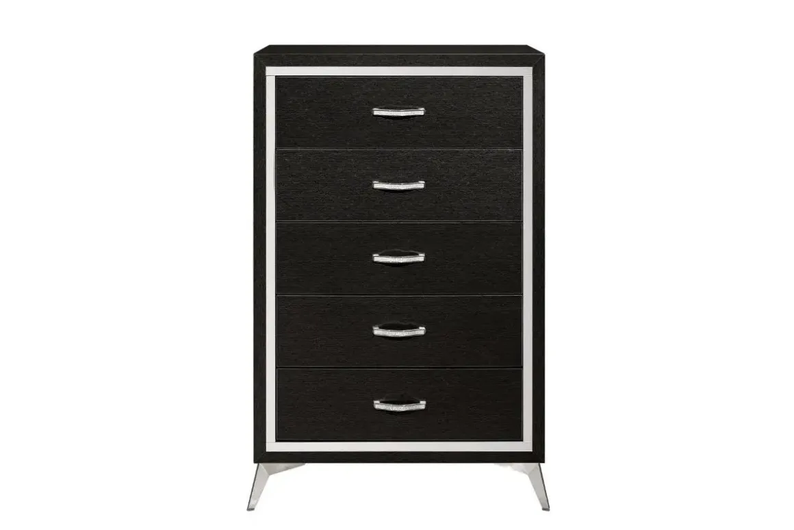 Enjoy the convenience of organized storage with this beautifully crafted Huxley Chest in Black. The five spacious drawers offer generous storage for your essentials, while the full extension glides ensure smooth and easy access. The chest’s sturdy wood frame and elegant tapered metal legs create a strong and attractive base. Its gorgeous black color blends well with most decor schemes. Keep it looking its best by wiping it clean with a dry cloth. Product Details: • Constructed with solid wood • Five spacious drawers provide ample storage for all your essentials • Easy to maintain – simply wipe clean with a dry cloth