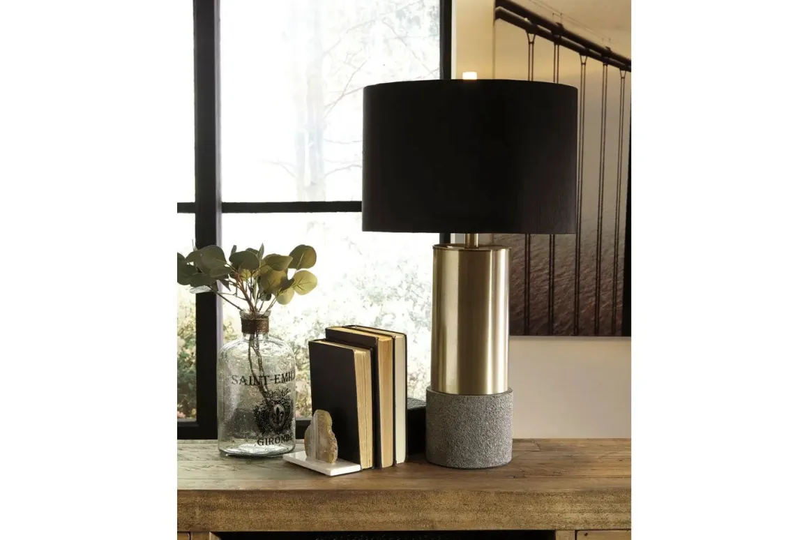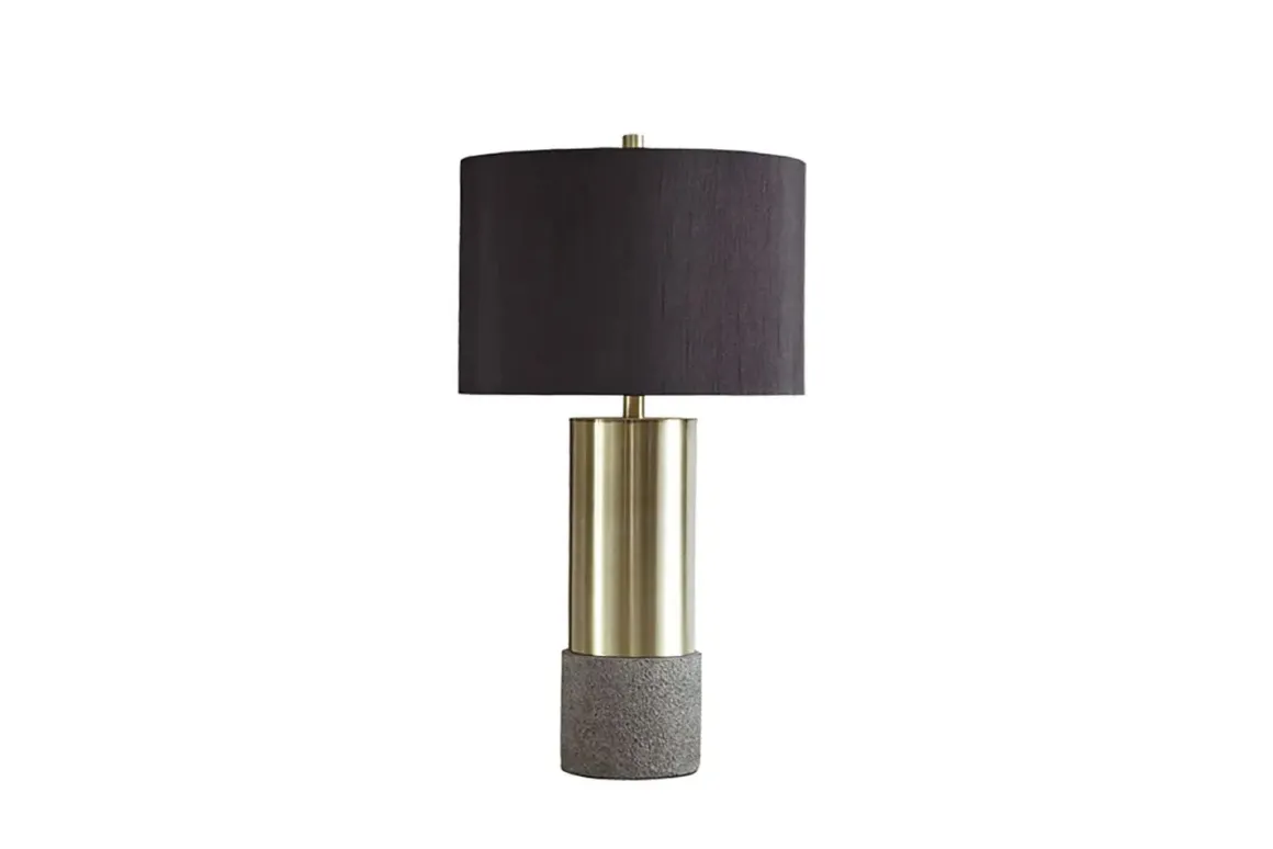 Faux concrete sets the stage for this ultra contemporary brass-tone table lamp. The Jacek Table Lamp is topped with a chic black shade with goldtone foil interior for an elegant aesthetic.