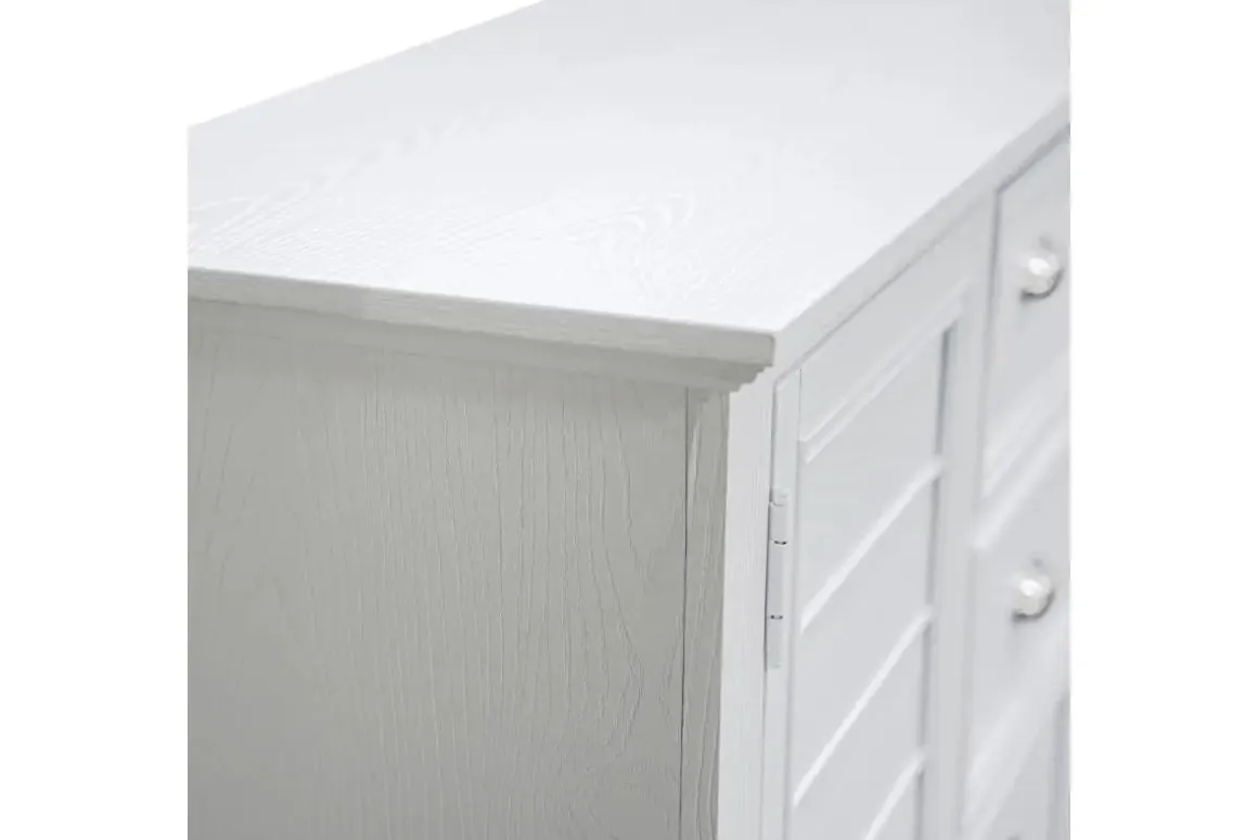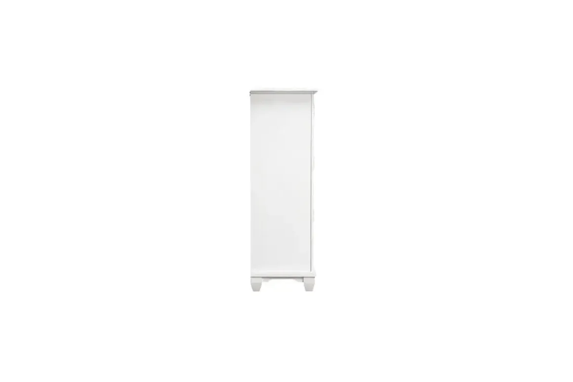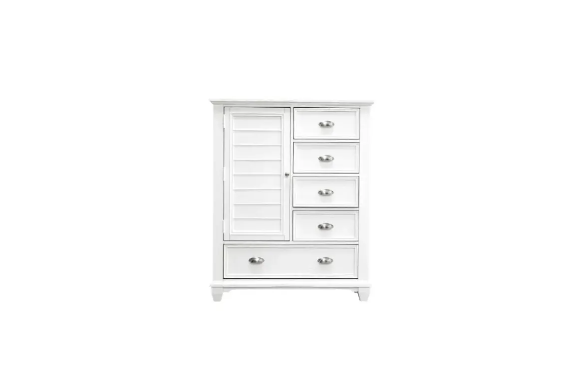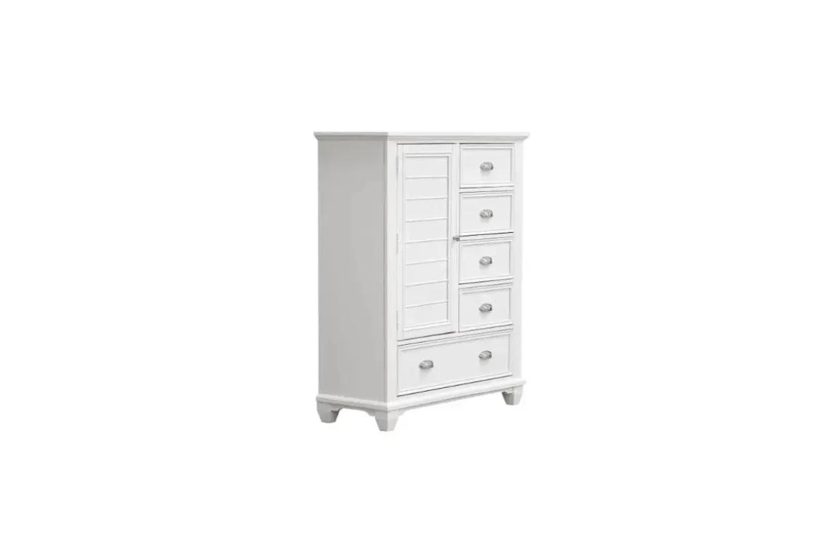 The Jamestown Door Chest in White offers a fresh and elegant storage solution for your bedroom. With five spacious drawers and a large cabinet with four shelves, this chest provides ample space to organize your clothing and essentials. Featuring full-extension drawer glides and French dovetail joints, this chest is fashionable while remaining functional. This chest is a versatile option for any bedroom environment. Product Details: • Crisp white finish adds a modern touch • Expertly crafted from acacia solids and oak veneers • Smooth full-extension drawers with French dovetail joints