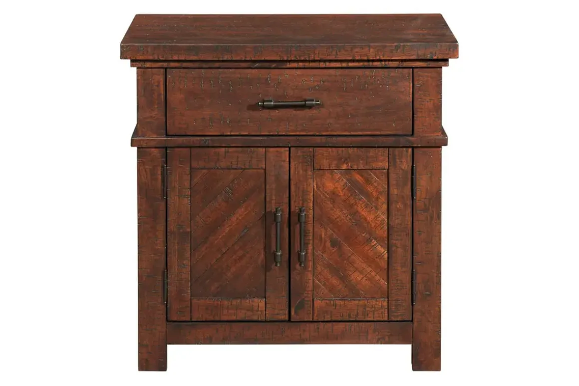 A great nightstand simply makes the room feel complete. Finish your bedroom with the Jax Nightstand in Walnut. The brown wood finish shows off the beauty of wood grain. With cabinet doors and a drawer for storage there is room to keep important things out of the way and still have room on the top. Keep your phone and glasses close by while you sleep. The rectangular slab top has space for the essentials, and a good nightstand is essential.