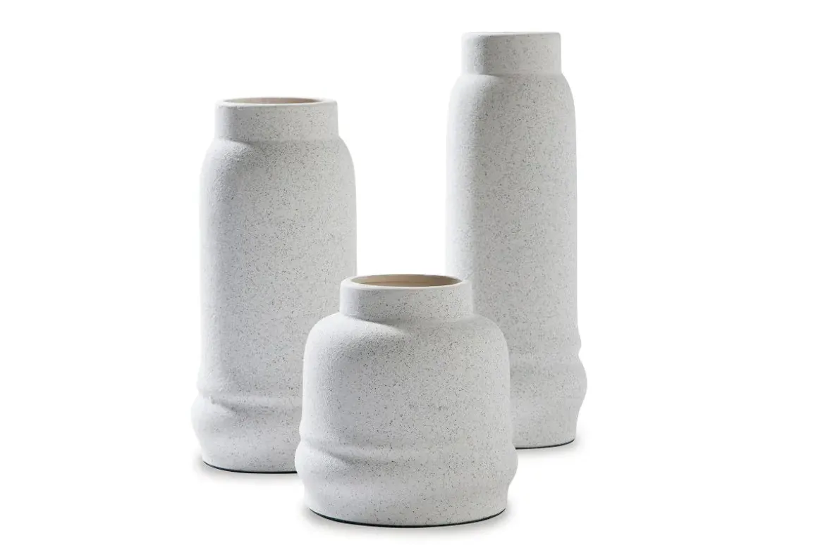 The Jayden Vase, Set of 3, is a collection of textured white ceramic vases that will look amazing in your home. Use them to create floral arrangements that will be the envy of your guests. With three different sizes in the set, you’ll have no trouble finding creative and unique ways to integrate these beautiful pieces into your home decor. Product Details: • White glaze finish works well with most home designs • Made of ceramic • Includes a small, medium, and large size matching vase