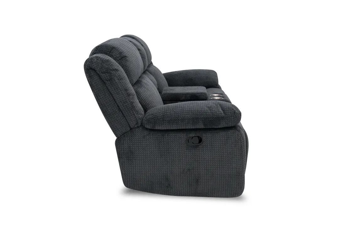 Elevate your lounging experience with the Jayne Reclining Console Loveseat in Charcoal. Its sleek, modern silhouette and deep charcoal upholstery bring a sophisticated touch to any living space while offering the ultimate in comfort. Two generously padded reclining seats invite you to relax, while the center console keeps essentials close with built-in storage and dual cup holders—perfect for movie nights or game-day gatherings. The durable fabric and smooth manual reclining mechanism make this loveseat a practical choice for families who value both style and function. Pair it with contemporary decor for a chic, cozy vibe.