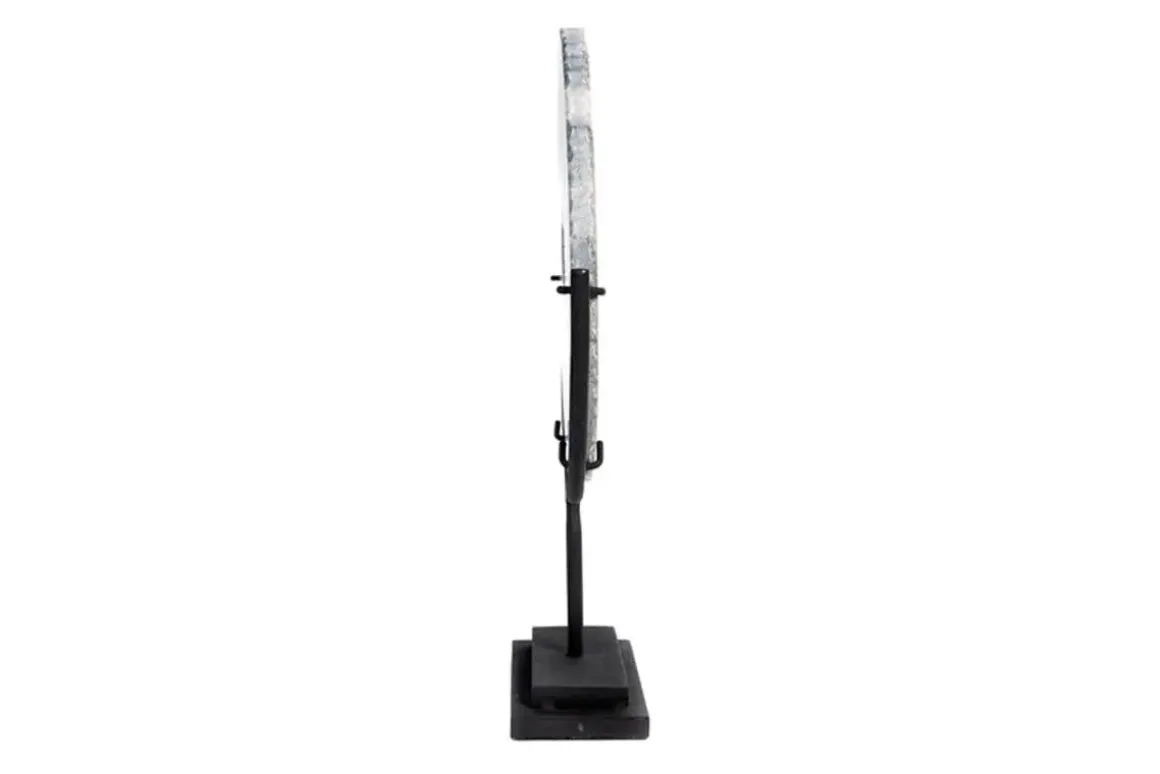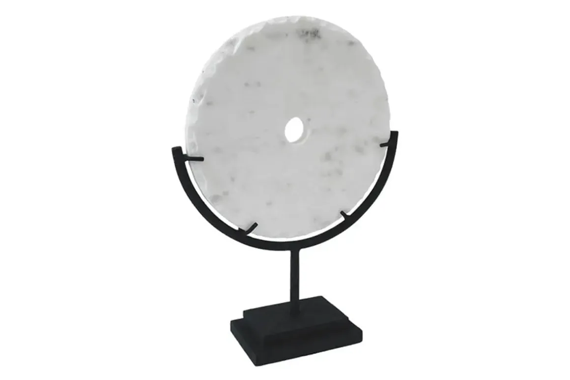 • Conversation-piece marble disc cradled in a metal frame on the lower half