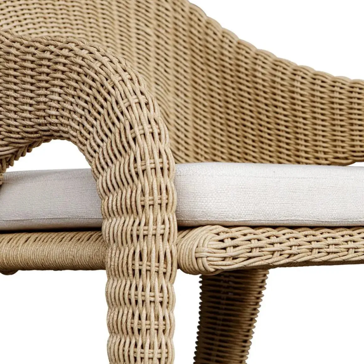 The Kavali Counter Stool showcases a curvaceous frame, crafted from hand wrapped, all-weather wicker in a natural honey finish. The plush cushion is upholstered in oyster white solution dyed acrylic fabric that is constructed to withstand the moisture and dirt that comes with outdoor use.