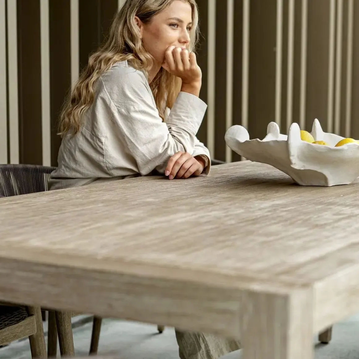 This contemporary farmhouse dining table showcases expert craftsmanship with its solid mahogany construction and cerused wheat finish. The table’s smooth finish and attention to detail highlight the natural beauty of the wood, creating a piece that will be admired for years to come. Solid wood will continue to move with temperature and humidity changes, which can result in cracks and uneven surfaces, adding to its authenticity and character. Suitable for both indoor and outdoor use.