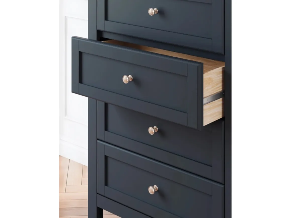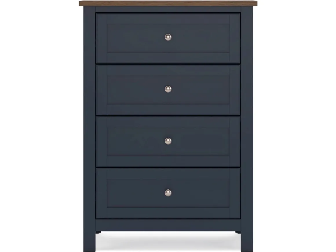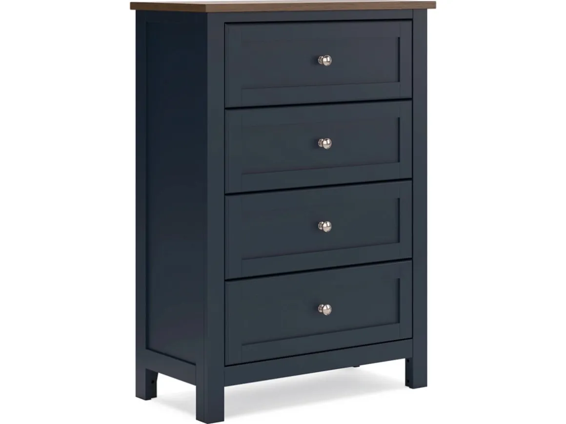Bring bold style and smart storage to your bedroom with the Landocken Chest in Brown and Blue. This four-drawer chest combines a rich brown wood top with a deep navy-blue base for a striking two-tone design that feels fresh yet timeless. Each drawer glides smoothly to keep clothing and essentials organized, while sleek metal knobs add a refined finishing touch. Perfect for smaller spaces or as a complement to the Landocken dresser, this piece blends durability with eye-catching design for a bedroom upgrade that stands out.