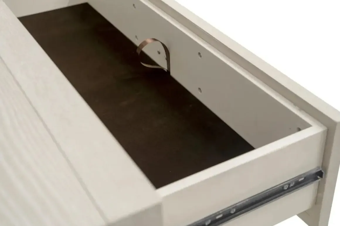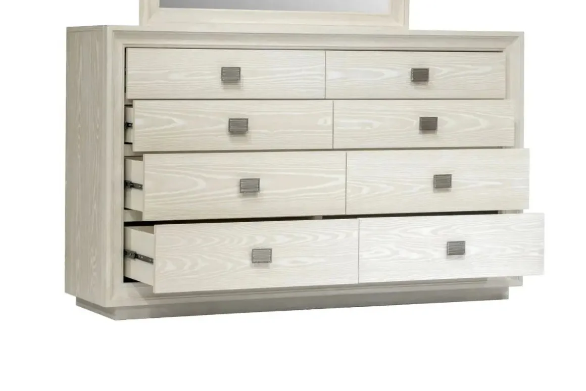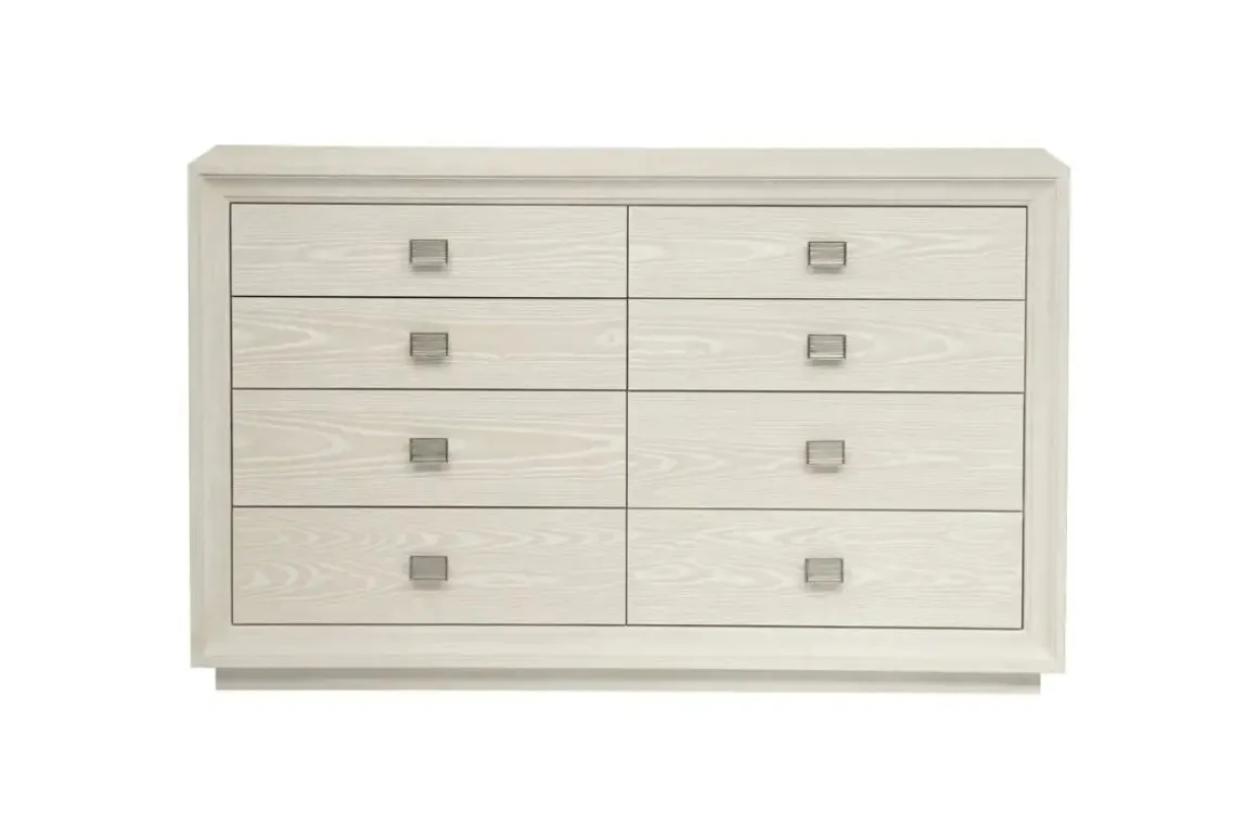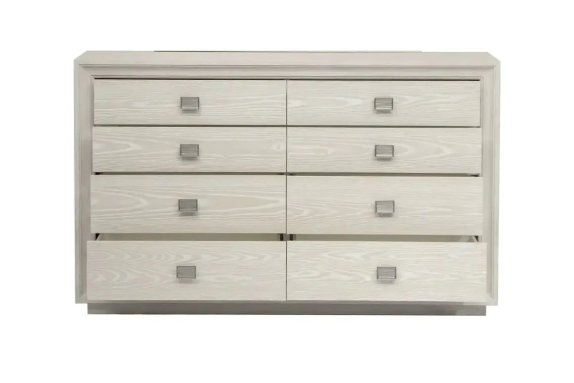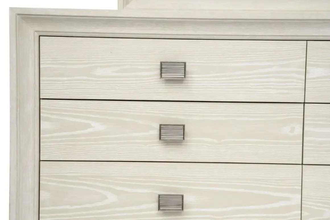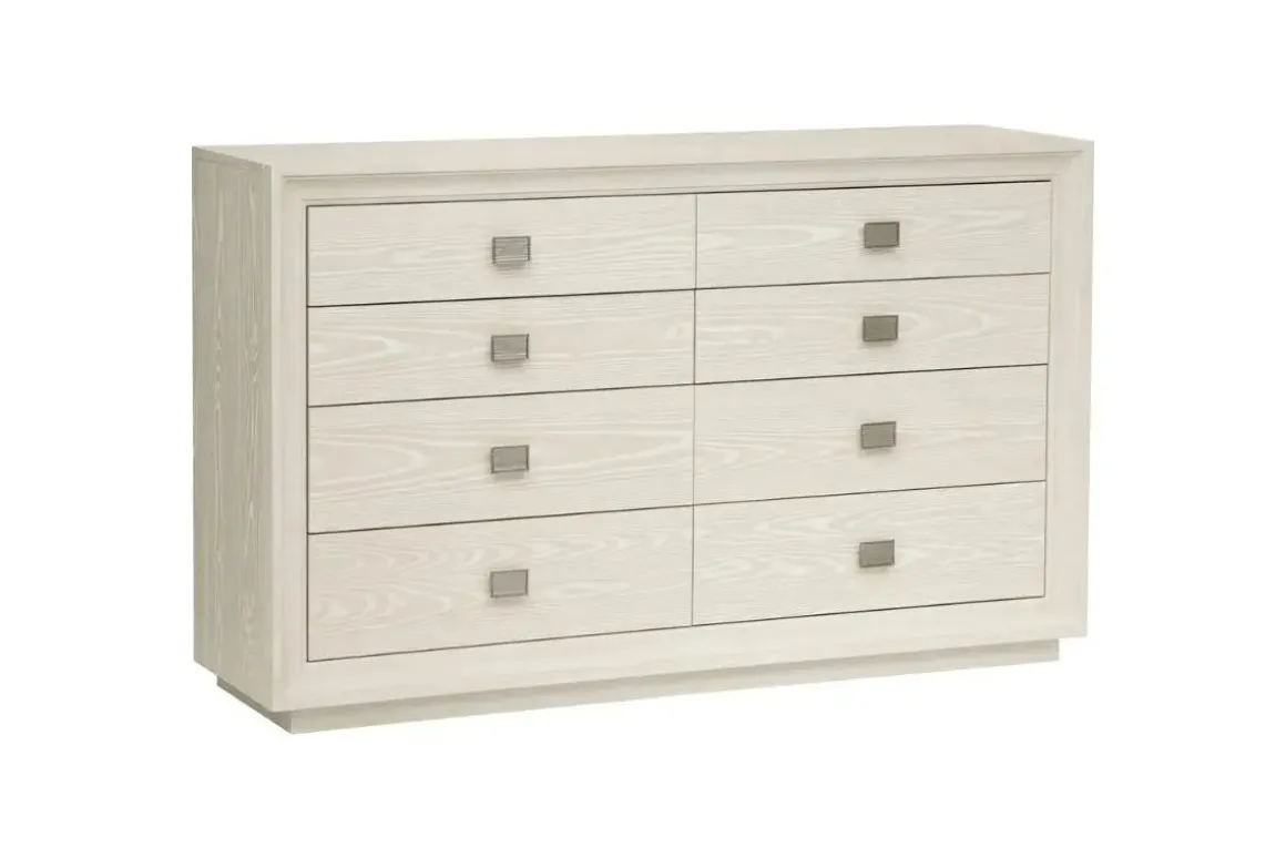 Maxime Dresser in Sugar blends a crisp modern silhouette with traditional picture frame moldings and jewel-like, custom molded metal pulls. Made from a mix of quartered and flat cut Ash wood veneer and meranti solid wood, the proprietary Sugar finish showcases the wood‘s active grain with a beige base and a soft white powder glaze resting on top.