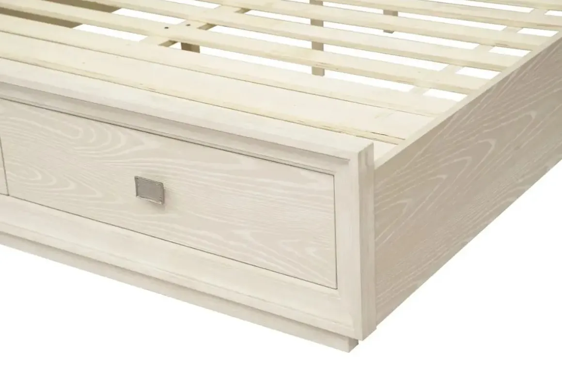 The Maxime Storage Bed in Sugar, Full blends a crisp modern silhouette with traditional picture frame moldings. Made from a mix of quartered and flat cut Ash wood veneer and meranti solid wood, the proprietary Sugar finish showcases the wood‘s active grain with a beige base and a soft white powder glaze resting on top. The Frame features iintegrated mattress support with plywood slats and side rails for support and has nylon glides for additional stability.