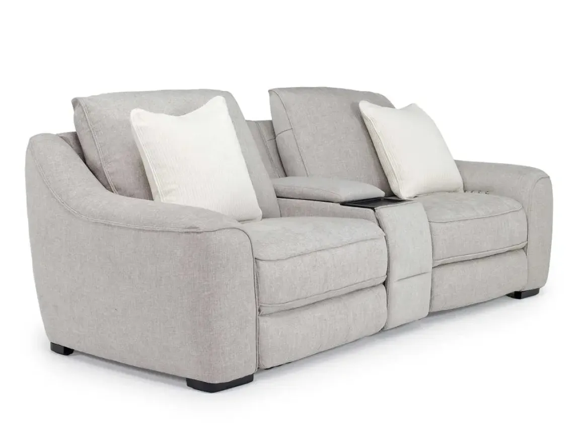 Enhance your relaxation with the Mayflower 2 Power Console Loveseat in Ashland Sand. This loveseat offers dual power reclining seats and a convenient center Audio console with cupholders, a speaker and USB ports. The plush fabric upholstery and down alternative seat composition ensure a comfortable and stylish seating experience.