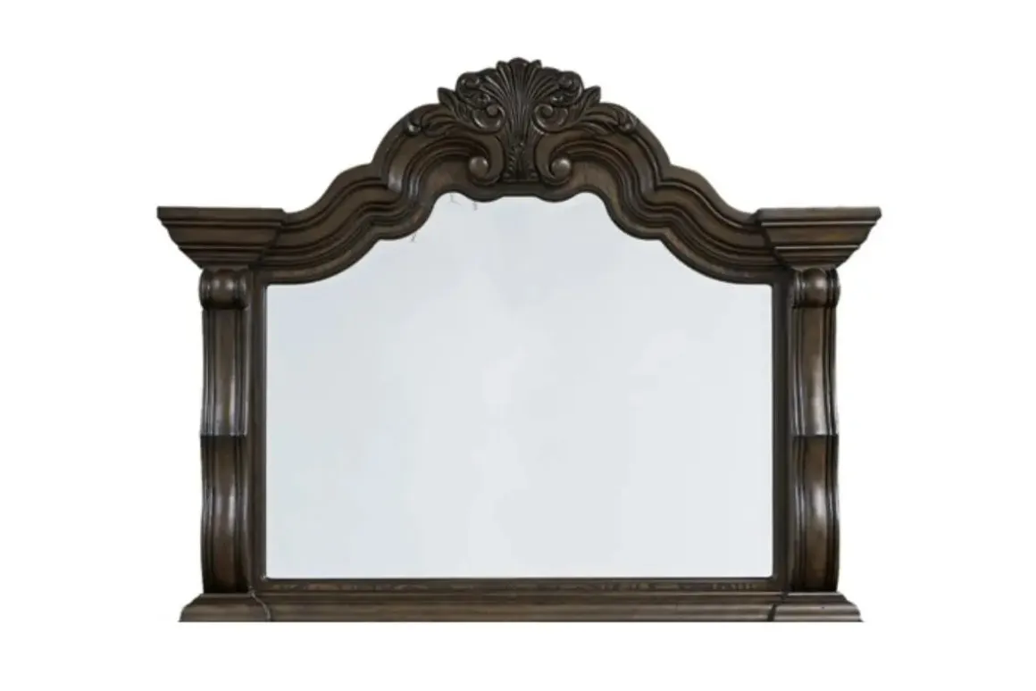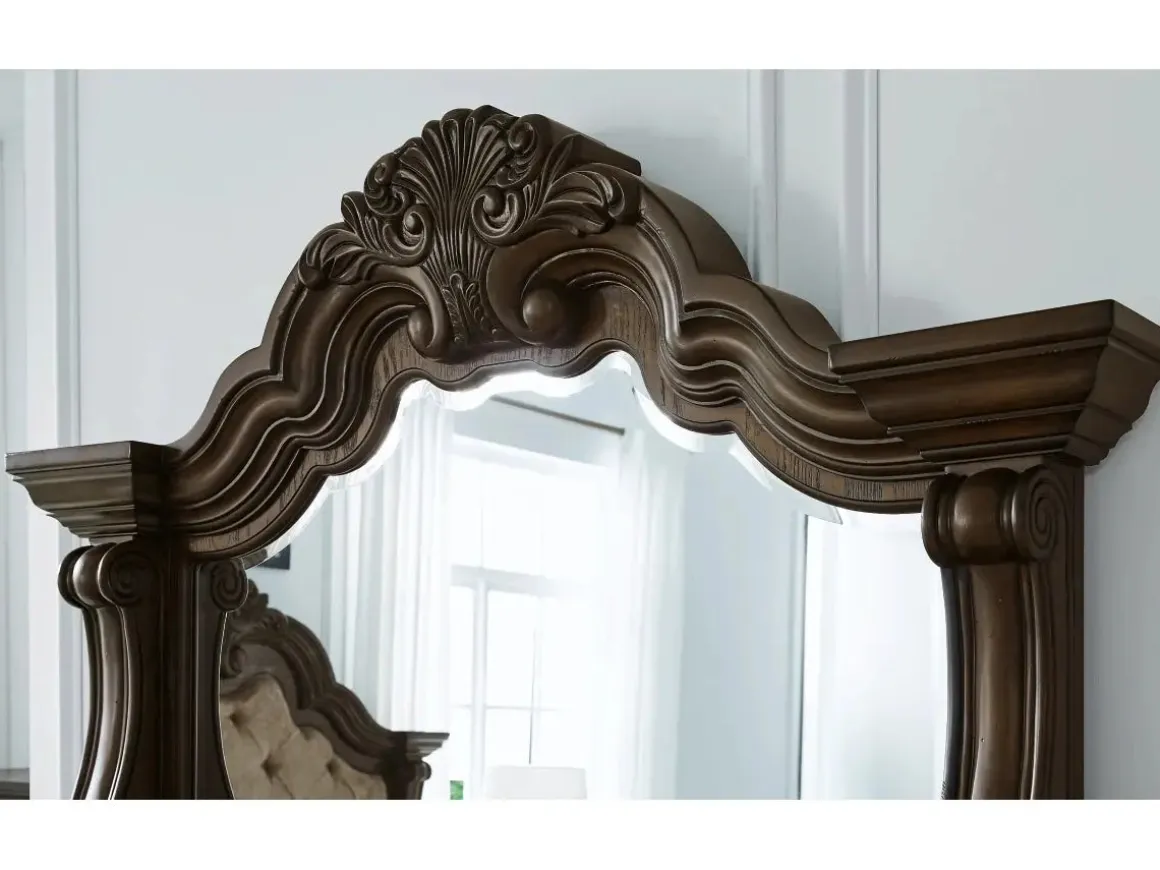 The Maylee Mirror in Dark Brown is made with oak and ash swirl veneers with MDF substrates and cast resin components. Features an ornate frame and a dark finish. Pairs with Maylee Dresser. This mirror attaches to its coordinating dresser. Additional hardware may be needed for wall installation.