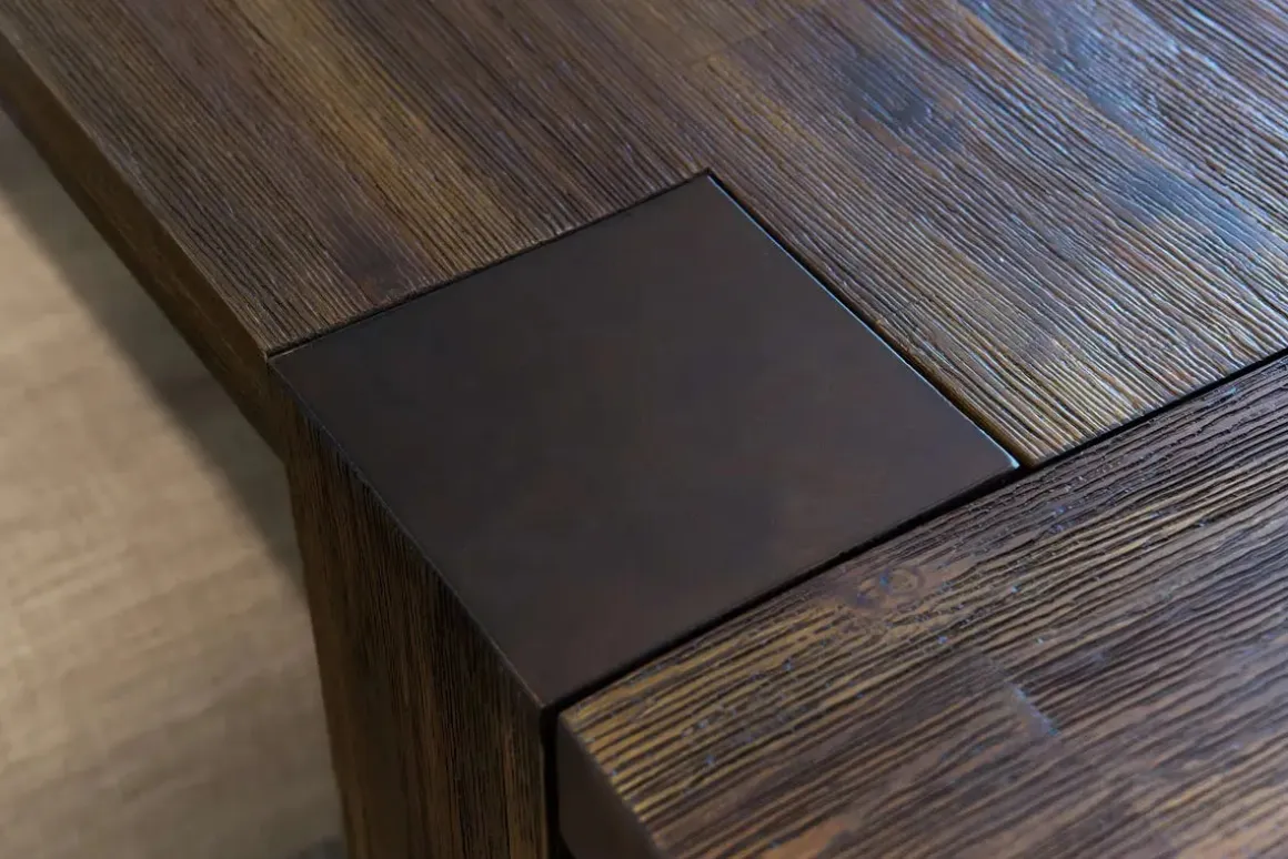 • Slab top table is finished in classic mahogany